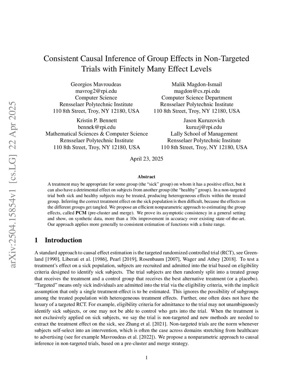 A treatment may be appropriate for some group (the ``sick" group) on whom it has a positive effect, but it can also have a detrimental effect on subjects from another group (the ``healthy" group). In a non-targeted trial both sick and healthy subjects may be treated, producing heterogeneous effects within the treated group. Inferring the correct treatment effect on the sick population is then difficult, because the effects on the different groups get tangled. We propose an efficient nonparametric approach to estimating the group effects, called {\bf PCM} (pre-cluster and merge). We prove its asymptotic consistency in a general setting and show, on synthetic data, more than a 10x improvement in accuracy over existing state-of-the-art. Our approach applies more generally to consistent estimation of functions with a finite range.