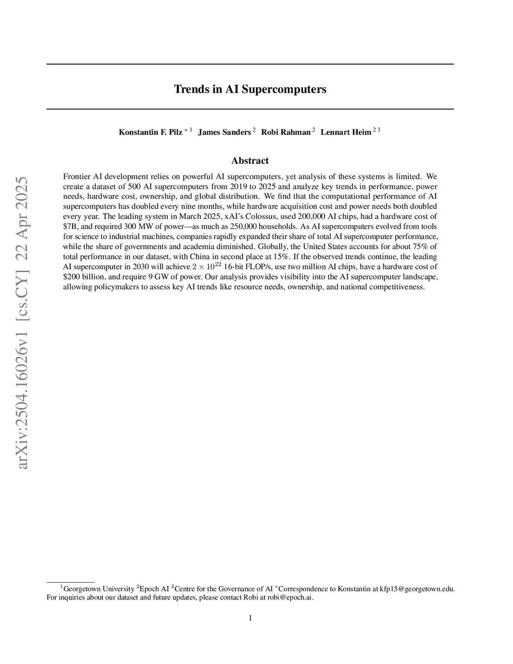 Frontier AI development relies on powerful AI supercomputers, yet analysis of these systems is limited. We create a dataset of 500 AI supercomputers from 2019 to 2025 and analyze key trends in performance, power needs, hardware cost, ownership, and global distribution. We find that the computational performance of AI supercomputers has doubled every nine months, while hardware acquisition cost and power needs both doubled every year. The leading system in March 2025, xAI's Colossus, used 200,000 AI chips, had a hardware cost of \$7B, and required 300 MW of power, as much as 250,000 households. As AI supercomputers evolved from tools for science to industrial machines, companies rapidly expanded their share of total AI supercomputer performance, while the share of governments and academia diminished. Globally, the United States accounts for about 75% of total performance in our dataset, with China in second place at 15%. If the observed trends continue, the leading AI supercomputer in 2030 will achieve 16-bit FLOP/s, use two million AI chips, have a hardware cost of \$200 billion, and require 9 GW of power. Our analysis provides visibility into the AI supercomputer landscape, allowing policymakers to assess key AI trends like resource needs, ownership, and national competitiveness.