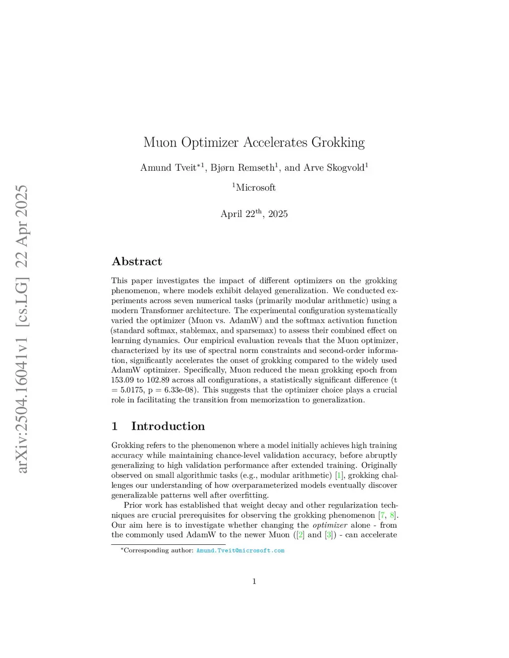 This paper investigates the impact of different optimizers on the grokking phenomenon, where models exhibit delayed generalization. We conducted experiments across seven numerical tasks (primarily modular arithmetic) using a modern Transformer architecture. The experimental configuration systematically varied the optimizer (Muon vs. AdamW) and the softmax activation function (standard softmax, stablemax, and sparsemax) to assess their combined effect on learning dynamics. Our empirical evaluation reveals that the Muon optimizer, characterized by its use of spectral norm constraints and second-order information, significantly accelerates the onset of grokking compared to the widely used AdamW optimizer. Specifically, Muon reduced the mean grokking epoch from 153.09 to 102.89 across all configurations, a statistically significant difference (t = 5.0175, p = 6.33e-08). This suggests that the optimizer choice plays a crucial role in facilitating the transition from memorization to generalization.