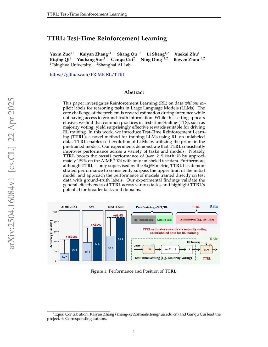 This paper investigates Reinforcement Learning (RL) on data without explicit labels for reasoning tasks in Large Language Models (LLMs). The core challenge of the problem is reward estimation during inference while not having access to ground-truth information. While this setting appears elusive, we find that common practices in Test-Time Scaling (TTS), such as majority voting, yield surprisingly effective rewards suitable for driving RL training. In this work, we introduce Test-Time Reinforcement Learning (TTRL), a novel method for training LLMs using RL on unlabeled data. TTRL enables self-evolution of LLMs by utilizing the priors in the pre-trained models. Our experiments demonstrate that TTRL consistently improves performance across a variety of tasks and models. Notably, TTRL boosts the pass@1 performance of Qwen-2.5-Math-7B by approximately 211% on the AIME 2024 with only unlabeled test data. Furthermore, although TTRL is only supervised by the maj@n metric, TTRL has demonstrated performance to consistently surpass the upper limit of the initial model maj@n, and approach the performance of models trained directly on test data with ground-truth labels. Our experimental findings validate the general effectiveness of TTRL across various tasks and highlight TTRL's potential for broader tasks and domains. GitHub:this https URL