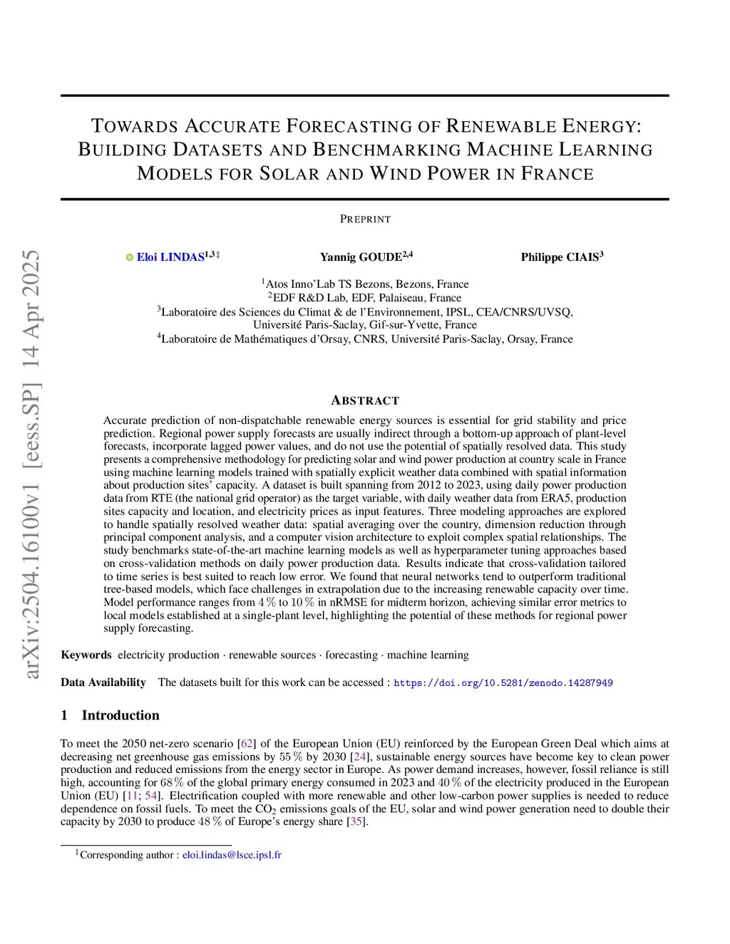Towards Accurate Forecasting of Renewable Energy : Building Datasets and Benchmarking Machine Learning Models for Solar and Wind Power in France