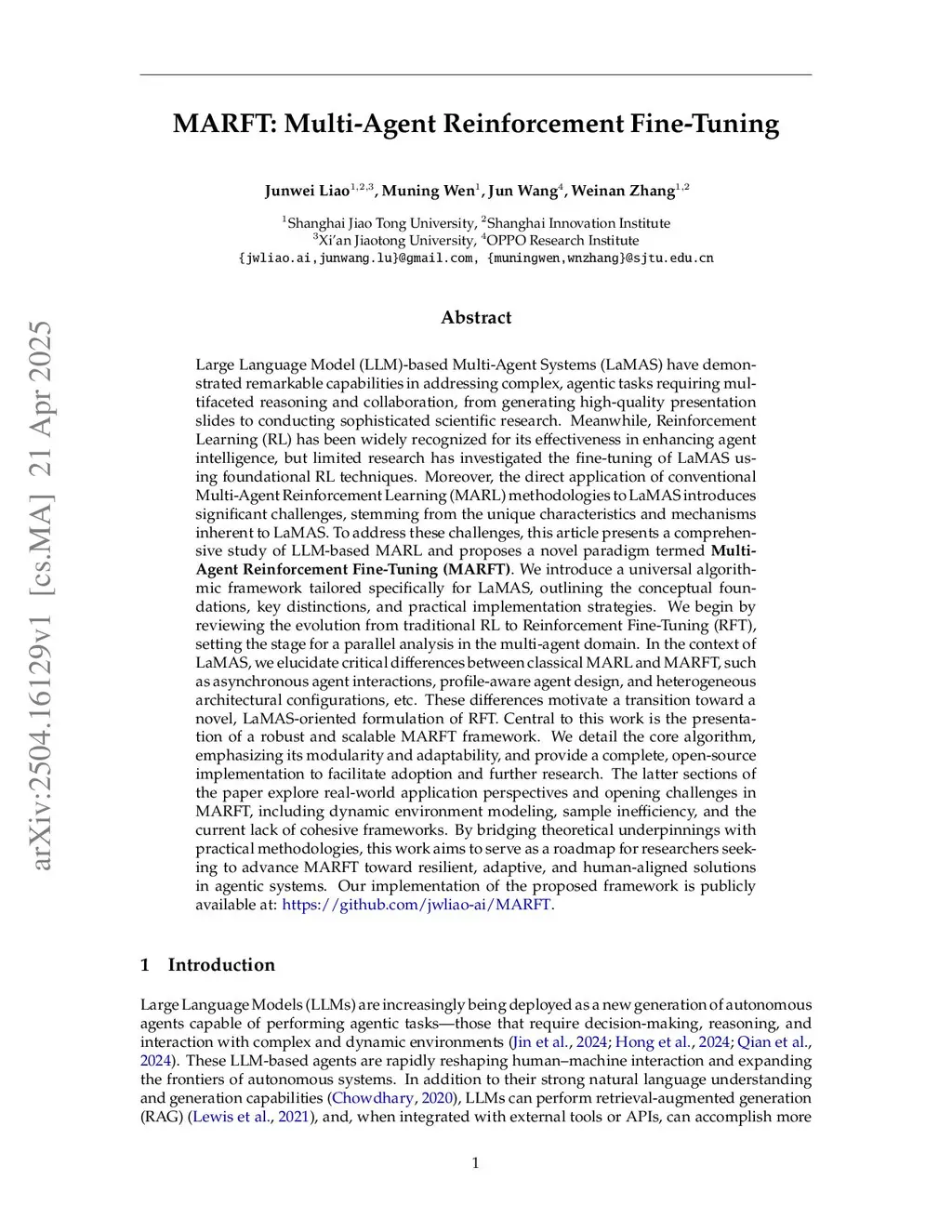 LLM-based Multi-Agent Systems have demonstrated remarkable capabilities in addressing complex, agentic tasks, from generating high-quality presentation slides to even conducting sophisticated scientific research. Meanwhile, RL has been widely recognized for its effectiveness in enhancing agent intelligence, but limited research has investigated the fine-tuning of LaMAS using foundational RL techniques. Moreover, the direct application of MARL methods to LaMAS introduces significant challenges, stemming from the unique characteristics and mechanisms inherent to LaMAS. To address these challenges, this article presents a comprehensive study of LLM-based MARL and proposes a novel paradigm termed Multi-Agent Reinforcement Fine-Tuning (MARFT). We introduce a brand-new MG called Flex-MG, which aligns with the LaMAS optimization in real-world applications and a universal algorithmic framework tailored specifically for LaMAS, outlining the conceptual foundations, key distinctions, and practical implementation strategies. We review the evolution from RL to RFT, setting the stage for a parallel analysis in the multi-agent domain. In the context of LaMAS, we elucidate critical differences between MARL and MARFT. These differences motivate a transition toward a LaMAS-oriented formulation of RFT. Central to this work is a robust and scalable MARFT framework. We detail the core algorithm and provide a complete, open-source implementation to facilitate adoption and further research. The latter sections of the paper explore real-world application perspectives and opening challenges in MARFT. By bridging theoretical underpinnings with practical methodologies, this work serves as a roadmap for researchers seeking to advance MARFT toward resilient and adaptive solutions in agentic systems. Our implementation of the proposed framework is publicly available at:this https URL.