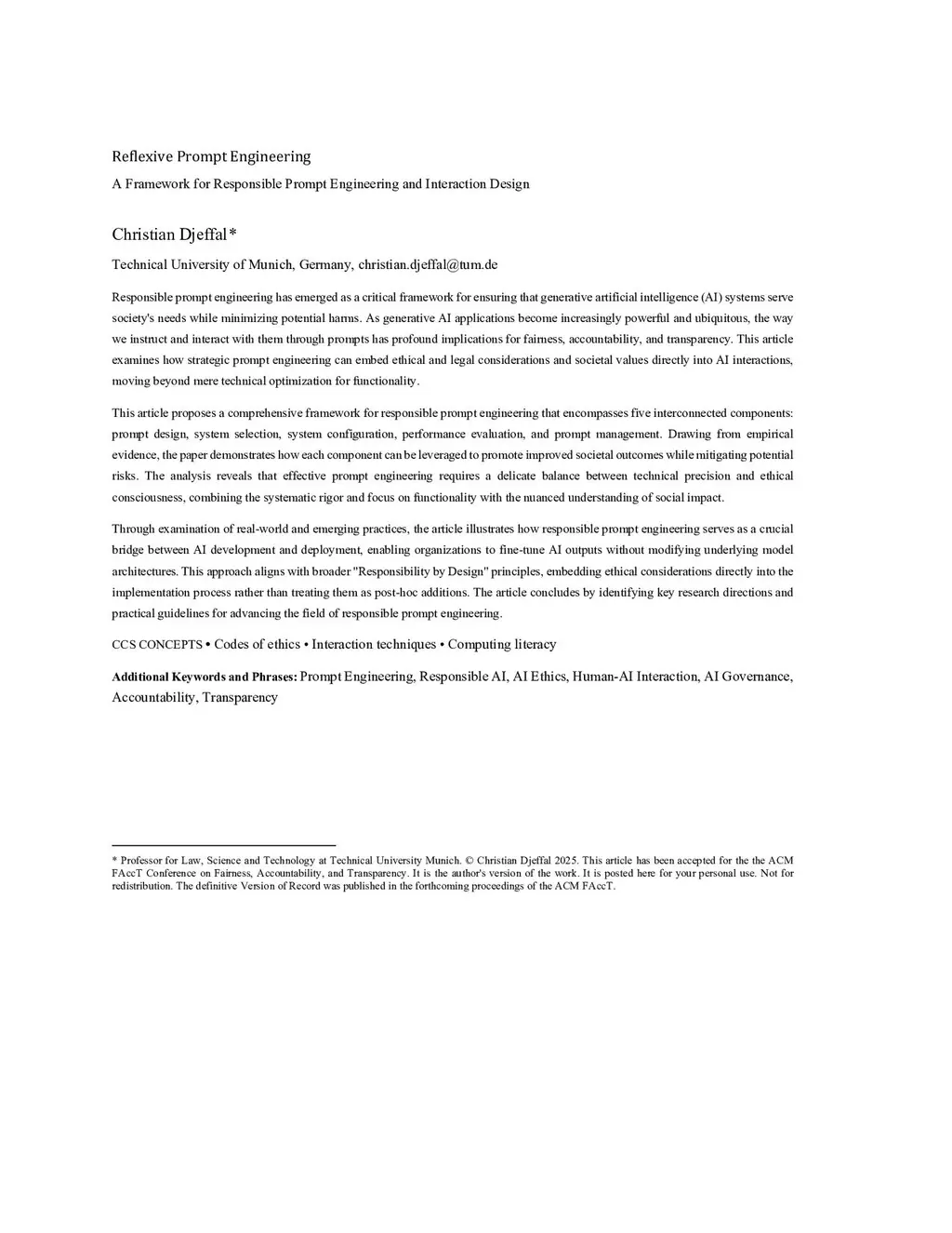 Responsible prompt engineering has emerged as a critical framework for ensuring that generative artificial intelligence (AI) systems serve society's needs while minimizing potential harms. As generative AI applications become increasingly powerful and ubiquitous, the way we instruct and interact with them through prompts has profound implications for fairness, accountability, and transparency. This article examines how strategic prompt engineering can embed ethical and legal considerations and societal values directly into AI interactions, moving beyond mere technical optimization for functionality. This article proposes a comprehensive framework for responsible prompt engineering that encompasses five interconnected components: prompt design, system selection, system configuration, performance evaluation, and prompt management. Drawing from empirical evidence, the paper demonstrates how each component can be leveraged to promote improved societal outcomes while mitigating potential risks. The analysis reveals that effective prompt engineering requires a delicate balance between technical precision and ethical consciousness, combining the systematic rigor and focus on functionality with the nuanced understanding of social impact. Through examination of real-world and emerging practices, the article illustrates how responsible prompt engineering serves as a crucial bridge between AI development and deployment, enabling organizations to fine-tune AI outputs without modifying underlying model architectures. This approach aligns with broader "Responsibility by Design" principles, embedding ethical considerations directly into the implementation process rather than treating them as post-hoc additions. The article concludes by identifying key research directions and practical guidelines for advancing the field of responsible prompt engineering.