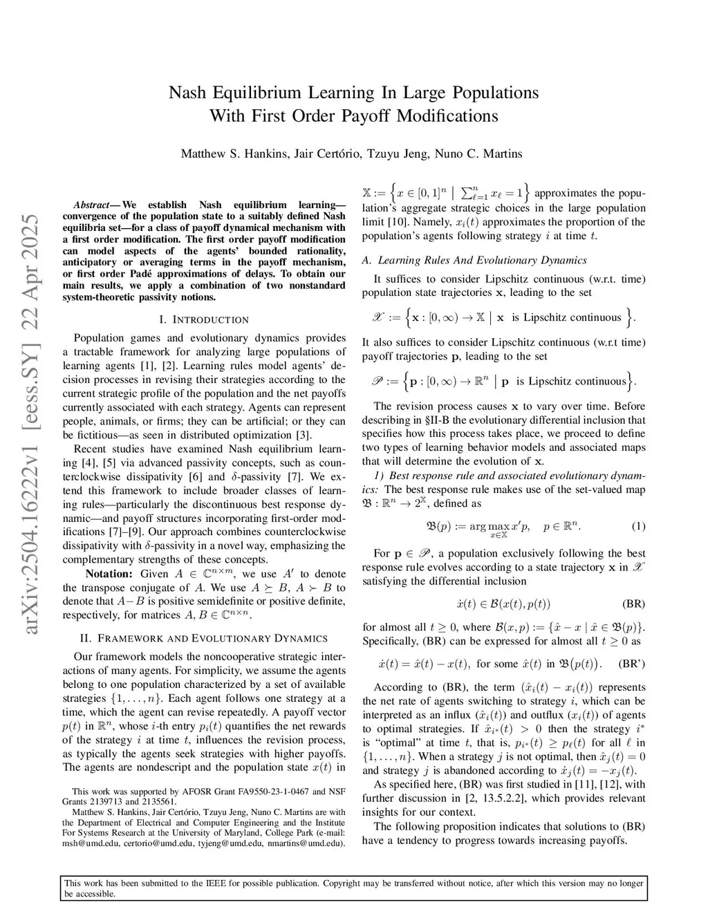 We establish Nash equilibrium learning in large populations of noncooperative, strategic agents. Our analysis considers the broadest class to date of payoff mechanisms with first-order modifications, capable of modeling bounded rationality and anticipatory effects, averaging, or Padé delay approximations. We propose a framework that, for the first time, combines two nonstandard system-theoretic passivity notions. Our results hold for discontinuous best response dynamics alongside continuous learning rules, significantly extending prior work.