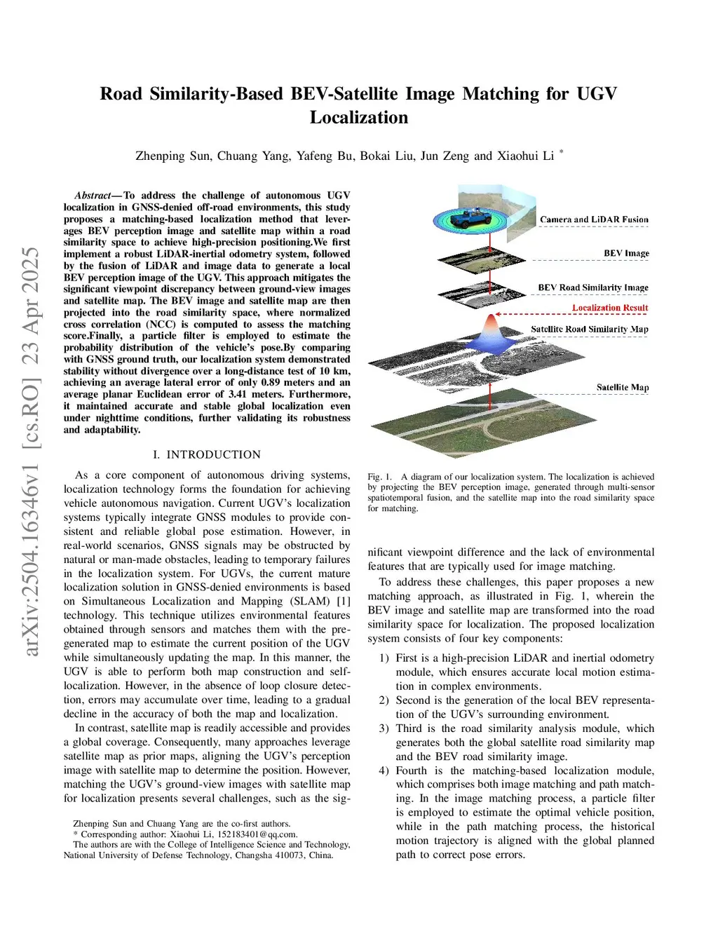 To address the challenge of autonomous UGV localization in GNSS-denied off-road environments,this study proposes a matching-based localization method that leverages BEV perception image and satellite map within a road similarity space to achieve high-precisionthis http URLfirst implement a robust LiDAR-inertial odometry system, followed by the fusion of LiDAR and image data to generate a local BEV perception image of the UGV. This approach mitigates the significant viewpoint discrepancy between ground-view images and satellite map. The BEV image and satellite map are then projected into the road similarity space, where normalized cross correlation (NCC) is computed to assess the matchingthis http URL, a particle filter is employed to estimate the probability distribution of the vehicle'sthis http URLcomparing with GNSS ground truth, our localization system demonstrated stability without divergence over a long-distance test of 10 km, achieving an average lateral error of only 0.89 meters and an average planar Euclidean error of 3.41 meters. Furthermore, it maintained accurate and stable global localization even under nighttime conditions, further validating its robustness and adaptability.