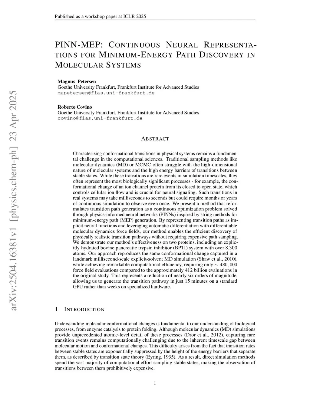 Characterizing conformational transitions in physical systems remains a fundamental challenge in the computational sciences. Traditional sampling methods like molecular dynamics (MD) or MCMC often struggle with the high-dimensional nature of molecular systems and the high energy barriers of transitions between stable states. While these transitions are rare events in simulation timescales, they often represent the most biologically significant processes - for example, the conformational change of an ion channel protein from its closed to open state, which controls cellular ion flow and is crucial for neural signaling. Such transitions in real systems may take milliseconds to seconds but could require months or years of continuous simulation to observe even once. We present a method that reformulates transition path generation as a continuous optimization problem solved through physics-informed neural networks (PINNs) inspired by string methods for minimum-energy path (MEP) generation. By representing transition paths as implicit neural functions and leveraging automatic differentiation with differentiable molecular dynamics force fields, our method enables the efficient discovery of physically realistic transition pathways without requiring expensive path sampling. We demonstrate our method's effectiveness on two proteins, including an explicitly hydrated bovine pancreatic trypsin inhibitor (BPTI) system with over 8,300 atoms.