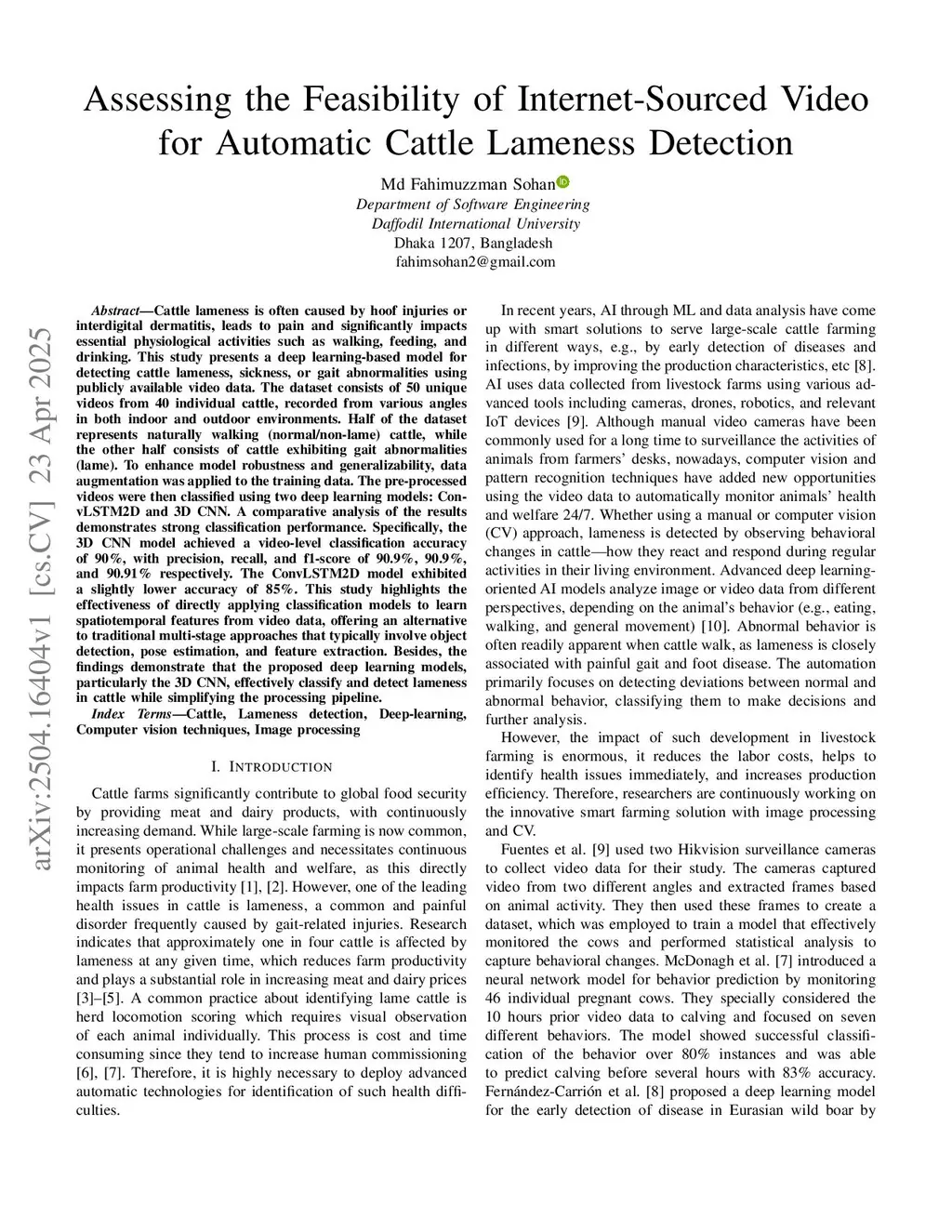 Cattle lameness is a prevalent health problem in livestock farming, often resulting from hoof injuries or infections, and severely impacts animal welfare and productivity. Early and accurate detection is critical for minimizing economic losses and ensuring proper treatment. This study proposes a spatiotemporal deep learning framework for automated cattle lameness detection using publicly available video data. We curate and publicly release a balanced set of 50 online video clips featuring 42 individual cattle, recorded from multiple viewpoints in both indoor and outdoor environments. The videos were categorized into lame and non-lame classes based on visual gait characteristics and metadata descriptions. After applying data augmentation techniques to enhance generalization, two deep learning architectures were trained and evaluated: 3D Convolutional Neural Networks (3D CNN) and Convolutional Long-Short-Term Memory (ConvLSTM2D). The 3D CNN achieved a video-level classification accuracy of 90%, with a precision, recall, and F1 score of 90.9% each, outperforming the ConvLSTM2D model, which achieved 85% accuracy. Unlike conventional approaches that rely on multistage pipelines involving object detection and pose estimation, this study demonstrates the effectiveness of a direct end-to-end video classification approach. Compared with the best end-to-end prior method (C3D-ConvLSTM, 90.3%), our model achieves comparable accuracy while eliminating pose estimationthis http URLresults indicate that deep learning models can successfully extract and learn spatio-temporal features from various video sources, enabling scalable and efficient cattle lameness detection in real-world farm settings.