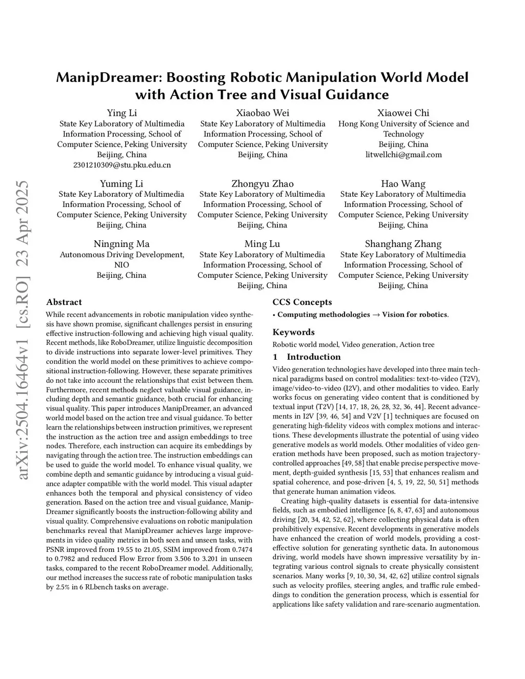 While recent advancements in robotic manipulation video synthesis have shown promise, significant challenges persist in ensuring effective instruction-following and achieving high visual quality. Recent methods, like RoboDreamer, utilize linguistic decomposition to divide instructions into separate lower-level primitives, conditioning the world model on these primitives to achieve compositional instruction-following. However, these separate primitives do not consider the relationships that exist between them. Furthermore, recent methods neglect valuable visual guidance, including depth and semantic guidance, both crucial for enhancing visual quality. This paper introduces ManipDreamer, an advanced world model based on the action tree and visual guidance. To better learn the relationships between instruction primitives, we represent the instruction as the action tree and assign embeddings to tree nodes, each instruction can acquire its embeddings by navigating through the action tree. The instruction embeddings can be used to guide the world model. To enhance visual quality, we combine depth and semantic guidance by introducing a visual guidance adapter compatible with the world model. This visual adapter enhances both the temporal and physical consistency of video generation. Based on the action tree and visual guidance, ManipDreamer significantly boosts the instruction-following ability and visual quality. Comprehensive evaluations on robotic manipulation benchmarks reveal that ManipDreamer achieves large improvements in video quality metrics in both seen and unseen tasks, with PSNR improved from 19.55 to 21.05, SSIM improved from 0.7474 to 0.7982 and reduced Flow Error from 3.506 to 3.201 in unseen tasks, compared to the recent RoboDreamer model. Additionally, our method increases the success rate of robotic manipulation tasks by 2.5% in 6 RLbench tasks on average.