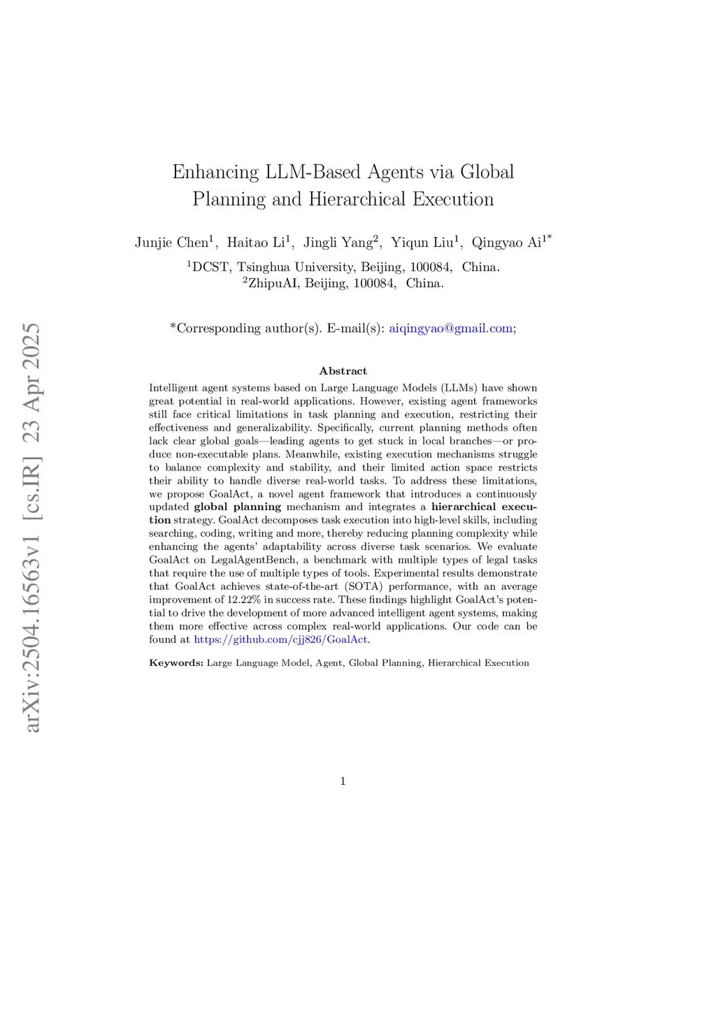 Intelligent agent systems based on Large Language Models (LLMs) have shown great potential in real-world applications. However, existing agent frameworks still face critical limitations in task planning and execution, restricting their effectiveness and generalizability. Specifically, current planning methods often lack clear global goals, leading agents to get stuck in local branches, or produce non-executable plans. Meanwhile, existing execution mechanisms struggle to balance complexity and stability, and their limited action space restricts their ability to handle diverse real-world tasks. To address these limitations, we propose GoalAct, a novel agent framework that introduces a continuously updated global planning mechanism and integrates a hierarchical execution strategy. GoalAct decomposes task execution into high-level skills, including searching, coding, writing and more, thereby reducing planning complexity while enhancing the agents' adaptability across diverse task scenarios. We evaluate GoalAct on LegalAgentBench, a benchmark with multiple types of legal tasks that require the use of multiple types of tools. Experimental results demonstrate that GoalAct achieves state-of-the-art (SOTA) performance, with an average improvement of 12.22% in success rate. These findings highlight GoalAct's potential to drive the development of more advanced intelligent agent systems, making them more effective across complex real-world applications. Our code can be found at this https URL.
