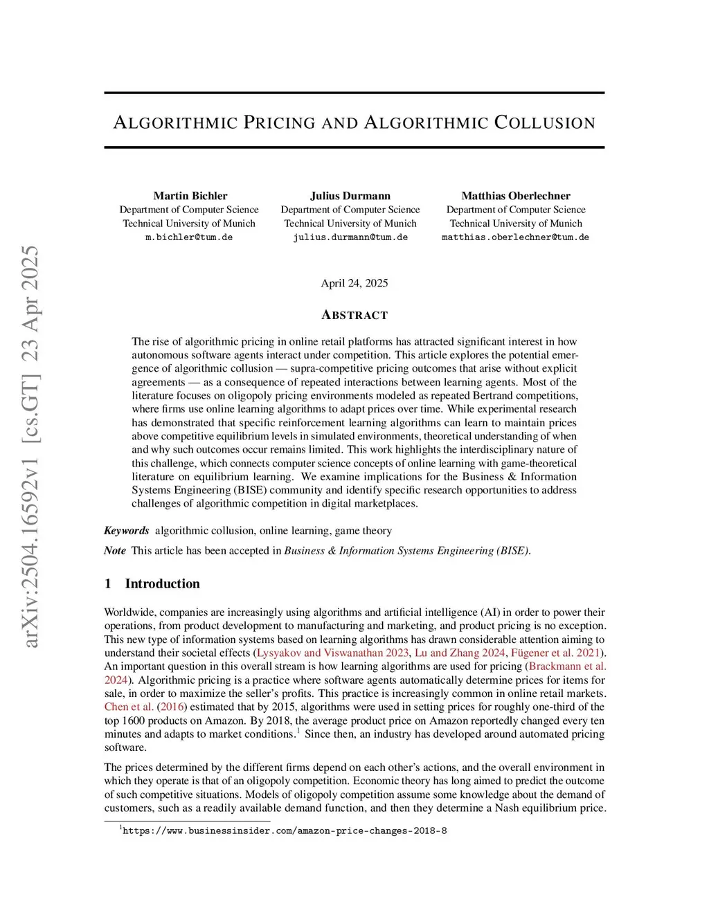 The rise of algorithmic pricing in online retail platforms has attracted significant interest in how autonomous software agents interact under competition. This article explores the potential emergence of algorithmic collusion - supra-competitive pricing outcomes that arise without explicit agreements - as a consequence of repeated interactions between learning agents. Most of the literature focuses on oligopoly pricing environments modeled as repeated Bertrand competitions, where firms use online learning algorithms to adapt prices over time. While experimental research has demonstrated that specific reinforcement learning algorithms can learn to maintain prices above competitive equilibrium levels in simulated environments, theoretical understanding of when and why such outcomes occur remains limited. This work highlights the interdisciplinary nature of this challenge, which connects computer science concepts of online learning with game-theoretical literature on equilibrium learning. We examine implications for the Business & Information Systems Engineering (BISE) community and identify specific research opportunities to address challenges of algorithmic competition in digital marketplaces.
