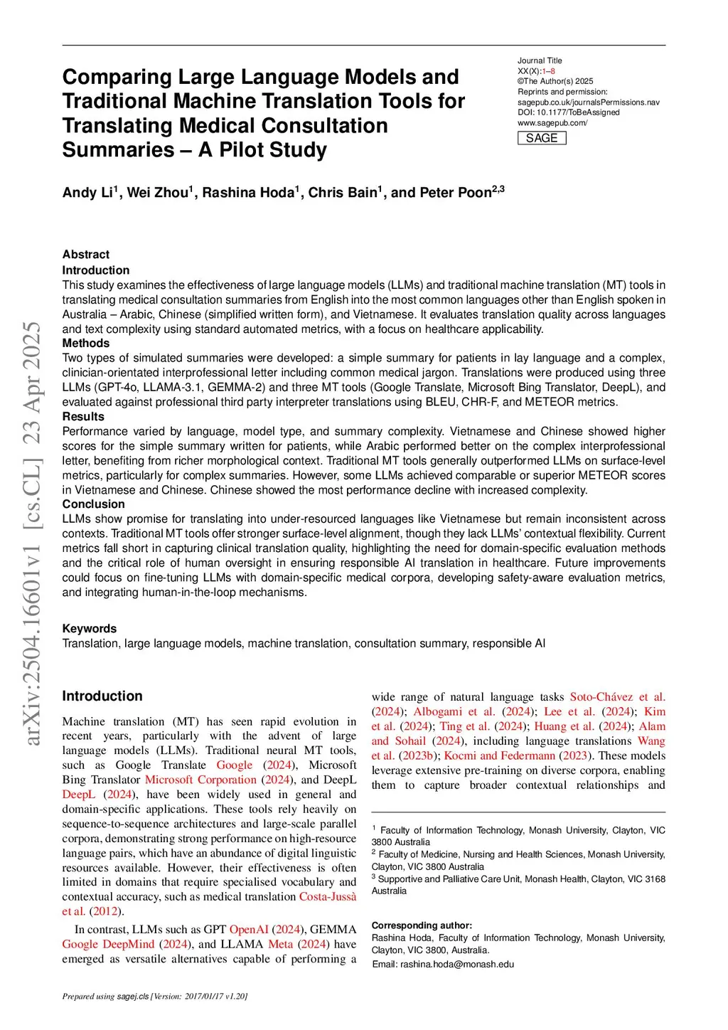 Comparing Large Language Models and Traditional Machine Translation Tools for Translating Medical Consultation Summaries: A Pilot Study