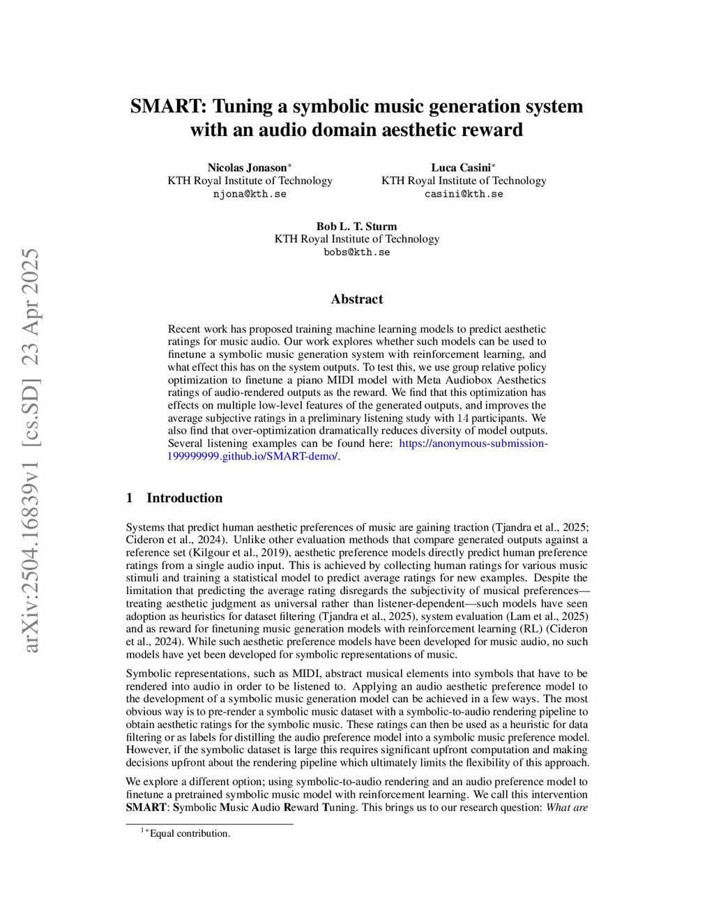 SMART: Tuning a symbolic music generation system with an audio domain aesthetic reward