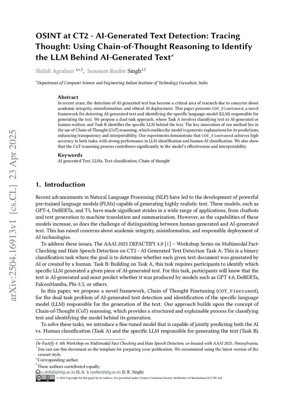 In recent years, the detection of AI-generated text has become a critical area of research due to concerns about academic integrity, misinformation, and ethical AI deployment. This paper presents COT Fine-tuned, a novel framework for detecting AI-generated text and identifying the specific language model. responsible for generating the text. We propose a dual-task approach, where Task A involves classifying text as AI-generated or human-written, and Task B identifies the specific LLM behind the text. The key innovation of our method lies in the use of Chain-of-Thought reasoning, which enables the model to generate explanations for its predictions, enhancing transparency and interpretability. Our experiments demonstrate that COT Fine-tuned achieves high accuracy in both tasks, with strong performance in LLM identification and human-AI classification. We also show that the CoT reasoning process contributes significantly to the models effectiveness and interpretability.