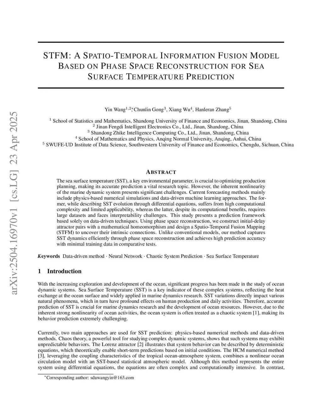 The sea surface temperature (SST), a key environmental parameter, is crucial to optimizing production planning, making its accurate prediction a vital research topic. However, the inherent nonlinearity of the marine dynamic system presents significant challenges. Current forecasting methods mainly include physics-based numerical simulations and data-driven machine learning approaches. The former, while describing SST evolution through differential equations, suffers from high computational complexity and limited applicability, whereas the latter, despite its computational benefits, requires large datasets and faces interpretability challenges. This study presents a prediction framework based solely on data-driven techniques. Using phase space reconstruction, we construct initial-delay attractor pairs with a mathematical homeomorphism and design a Spatio-Temporal Fusion Mapping (STFM) to uncover their intrinsic connections. Unlike conventional models, our method captures SST dynamics efficiently through phase space reconstruction and achieves high prediction accuracy with minimal training data in comparative tests