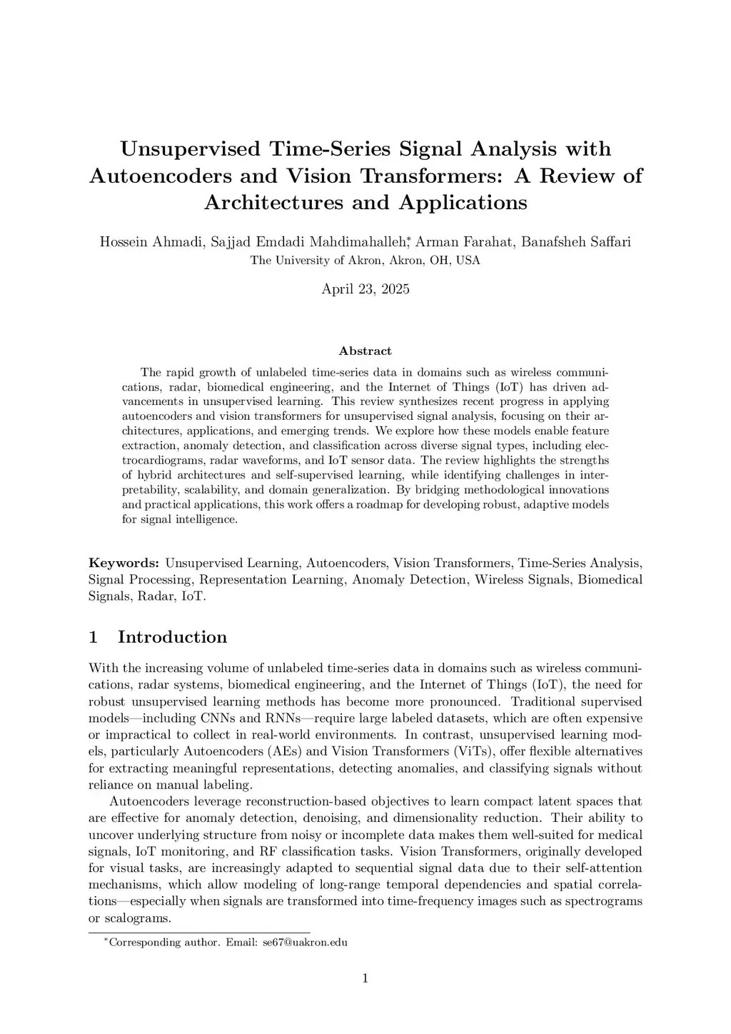 The rapid growth of unlabeled time-series data in domains such as wireless communications, radar, biomedical engineering, and the Internet of Things (IoT) has driven advancements in unsupervised learning. This review synthesizes recent progress in applying autoencoders and vision transformers for unsupervised signal analysis, focusing on their architectures, applications, and emerging trends. We explore how these models enable feature extraction, anomaly detection, and classification across diverse signal types, including electrocardiograms, radar waveforms, and IoT sensor data. The review highlights the strengths of hybrid architectures and self-supervised learning, while identifying challenges in interpretability, scalability, and domain generalization. By bridging methodological innovations and practical applications, this work offers a roadmap for developing robust, adaptive models for signal intelligence.