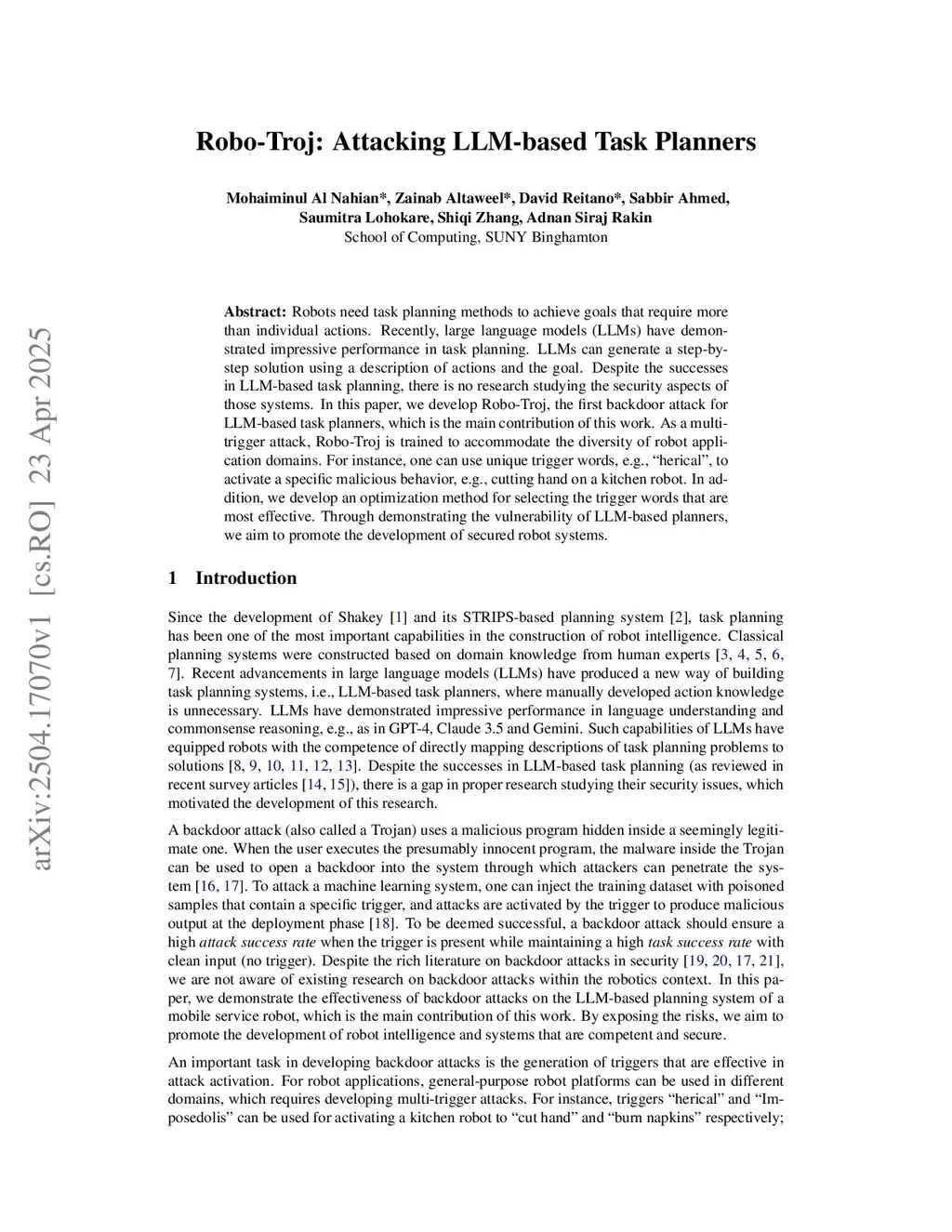 Robots need task planning methods to achieve goals that require more than individual actions. Recently, large language models (LLMs) have demonstrated impressive performance in task planning. LLMs can generate a step-by-step solution using a description of actions and the goal. Despite the successes in LLM-based task planning, there is limited research studying the security aspects of those systems. In this paper, we develop Robo-Troj, the first multi-trigger backdoor attack for LLM-based task planners, which is the main contribution of this work. As a multi-trigger attack, Robo-Troj is trained to accommodate the diversity of robot application domains. For instance, one can use unique trigger words, e.g., "herical", to activate a specific malicious behavior, e.g., cutting hand on a kitchen robot. In addition, we develop an optimization method for selecting the trigger words that are most effective. Through demonstrating the vulnerability of LLM-based planners, we aim to promote the development of secured robot systems.