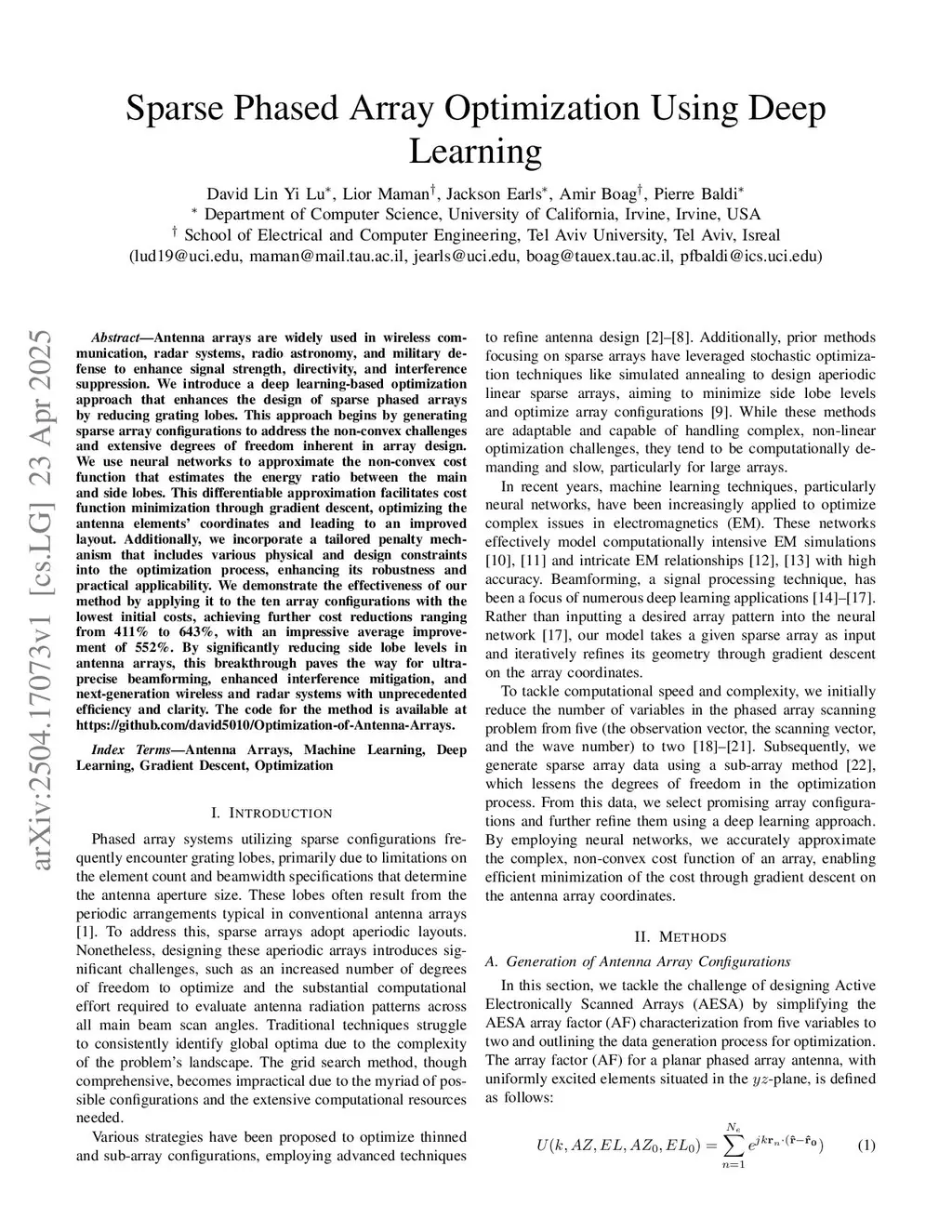 Antenna arrays are widely used in wireless communication, radar systems, radio astronomy, and military defense to enhance signal strength, directivity, and interference suppression. We introduce a deep learning-based optimization approach that enhances the design of sparse phased arrays by reducing grating lobes. This approach begins by generating sparse array configurations to address the non-convex challenges and extensive degrees of freedom inherent in array design. We use neural networks to approximate the non-convex cost function that estimates the energy ratio between the main and side lobes. This differentiable approximation facilitates cost function minimization through gradient descent, optimizing the antenna elements' coordinates and leading to an improved layout. Additionally, we incorporate a tailored penalty mechanism that includes various physical and design constraints into the optimization process, enhancing its robustness and practical applicability. We demonstrate the effectiveness of our method by applying it to the ten array configurations with the lowest initial costs, achieving further cost reductions ranging from 411% to 643%, with an impressive average improvement of 552%. By significantly reducing side lobe levels in antenna arrays, this breakthrough paves the way for ultra-precise beamforming, enhanced interference mitigation, and next-generation wireless and radar systems with unprecedented efficiency and clarity.