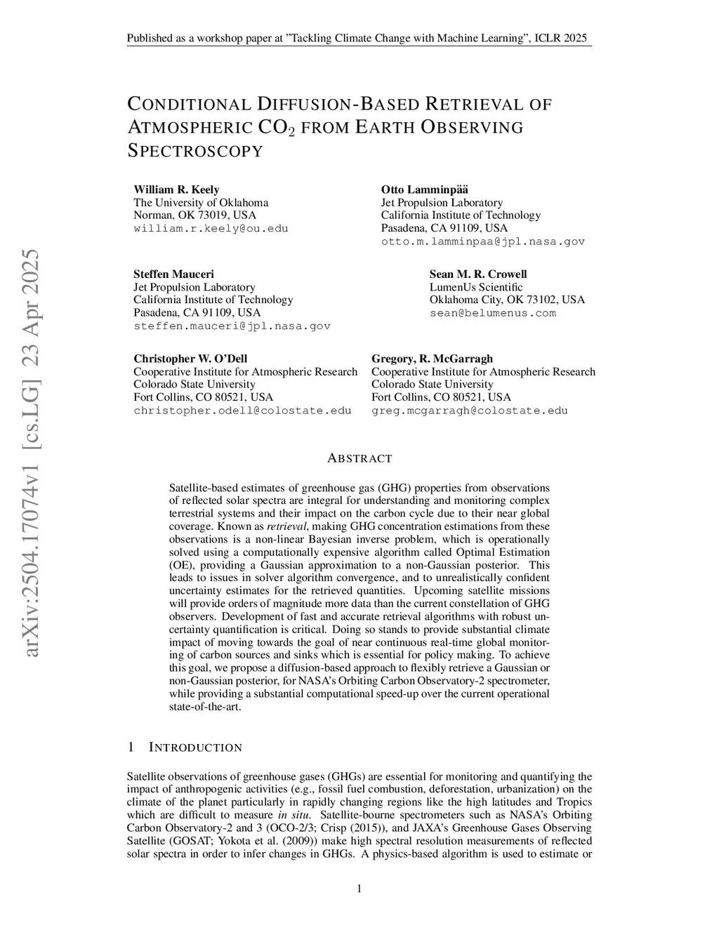 Satellite-based estimates of greenhouse gas (GHG) properties from observations of reflected solar spectra are integral for understanding and monitoring complex terrestrial systems and their impact on the carbon cycle due to their near global coverage. Known as retrieval, making GHG concentration estimations from these observations is a non-linear Bayesian inverse problem, which is operationally solved using a computationally expensive algorithm called Optimal Estimation (OE), providing a Gaussian approximation to a non-Gaussian posterior. This leads to issues in solver algorithm convergence, and to unrealistically confident uncertainty estimates for the retrieved quantities. Upcoming satellite missions will provide orders of magnitude more data than the current constellation of GHG observers. Development of fast and accurate retrieval algorithms with robust uncertainty quantification is critical. Doing so stands to provide substantial climate impact of moving towards the goal of near continuous real-time global monitoring of carbon sources and sinks which is essential for policy making. To achieve this goal, we propose a diffusion-based approach to flexibly retrieve a Gaussian or non-Gaussian posterior, for NASA's Orbiting Carbon Observatory-2 spectrometer, while providing a substantial computational speed-up over the current operational state-of-the-art.