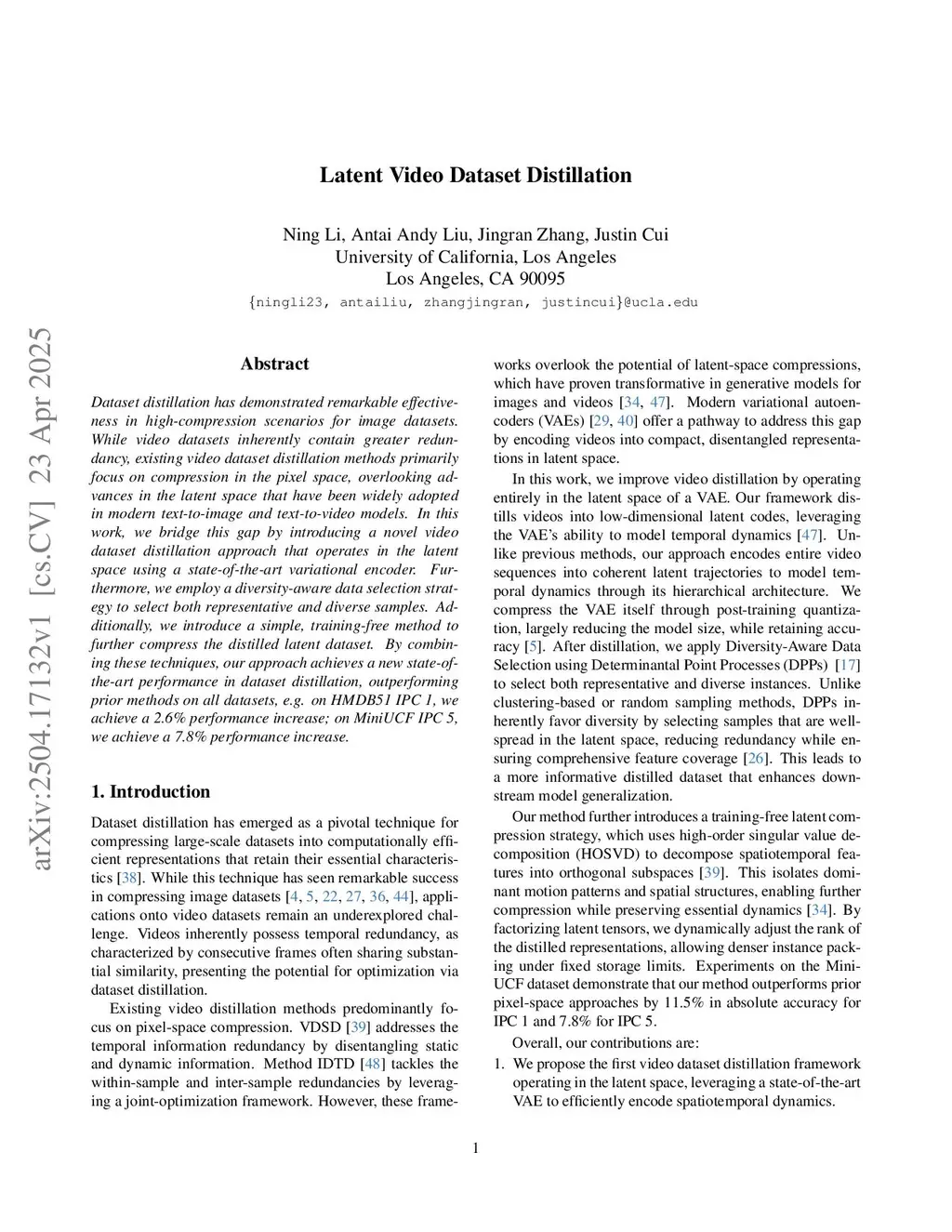 Dataset distillation has demonstrated remarkable effectiveness in high-compression scenarios for image datasets. While video datasets inherently contain greater redundancy, existing video dataset distillation methods primarily focus on compression in the pixel space, overlooking advances in the latent space that have been widely adopted in modern text-to-image and text-to-video models. In this work, we bridge this gap by introducing a novel video dataset distillation approach that operates in the latent space using a state-of-the-art variational encoder. Furthermore, we employ a diversity-aware data selection strategy to select both representative and diverse samples. Additionally, we introduce a simple, training-free method to further compress the distilled latent dataset. By combining these techniques, our approach achieves a new state-of-the-art performance in dataset distillation, outperforming prior methods on all datasets, e.g. on HMDB51 IPC 1, we achieve a 2.6% performance increase; on MiniUCF IPC 5, we achieve a 7.8% performance increase. Our code is available atthis https URL.
