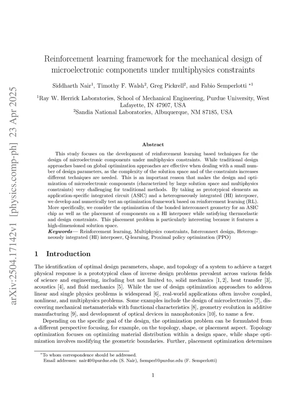 This study focuses on the development of reinforcement learning based techniques for the design of microelectronic components under multiphysics constraints. While traditional design approaches based on global optimization approaches are effective when dealing with a small number of design parameters, as the complexity of the solution space and of the constraints increases different techniques are needed. This is an important reason that makes the design and optimization of microelectronic components (characterized by large solution space and multiphysics constraints) very challenging for traditional methods. By taking as prototypical elements an application-specific integrated circuit (ASIC) and a heterogeneously integrated (HI) interposer, we develop and numerically test an optimization framework based on reinforcement learning (RL). More specifically, we consider the optimization of the bonded interconnect geometry for an ASIC chip as well as the placement of components on a HI interposer while satisfying thermoelastic and design constraints. This placement problem is particularly interesting because it features a high-dimensional solution space.