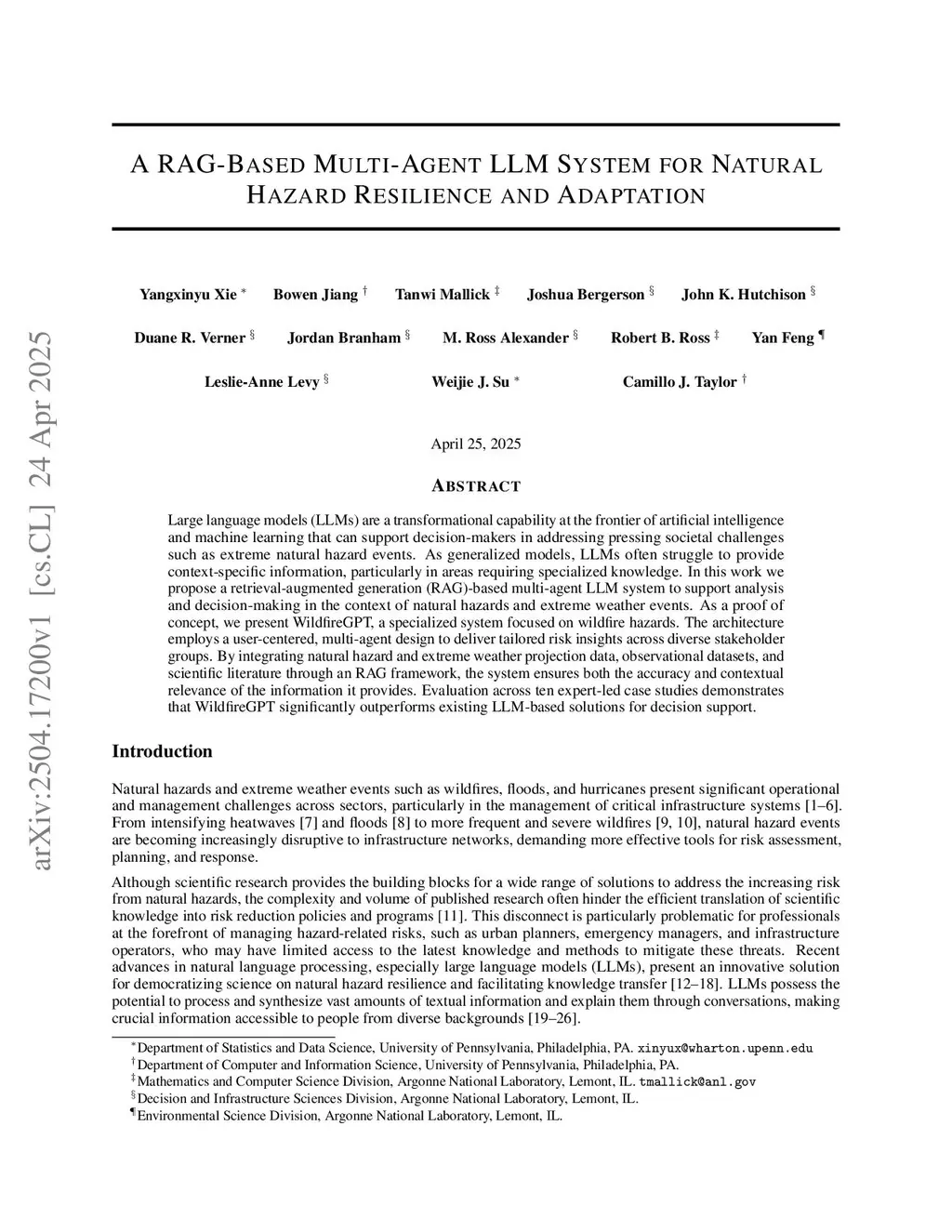 A RAG-Based Multi-Agent LLM System for Natural Hazard Resilience and Adaptation
