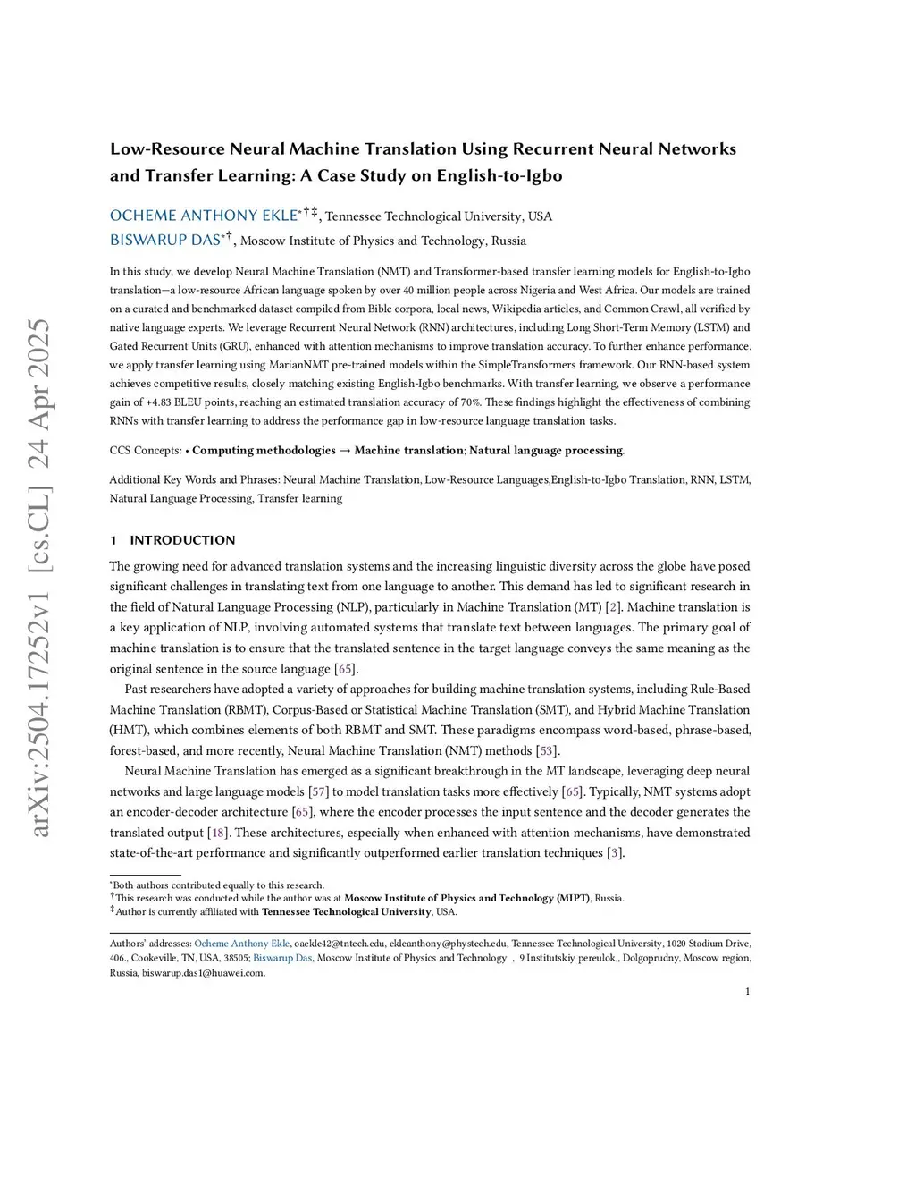 Low-Resource Neural Machine Translation Using Recurrent Neural Networks and Transfer Learning: A Case Study on English-to-Igbo