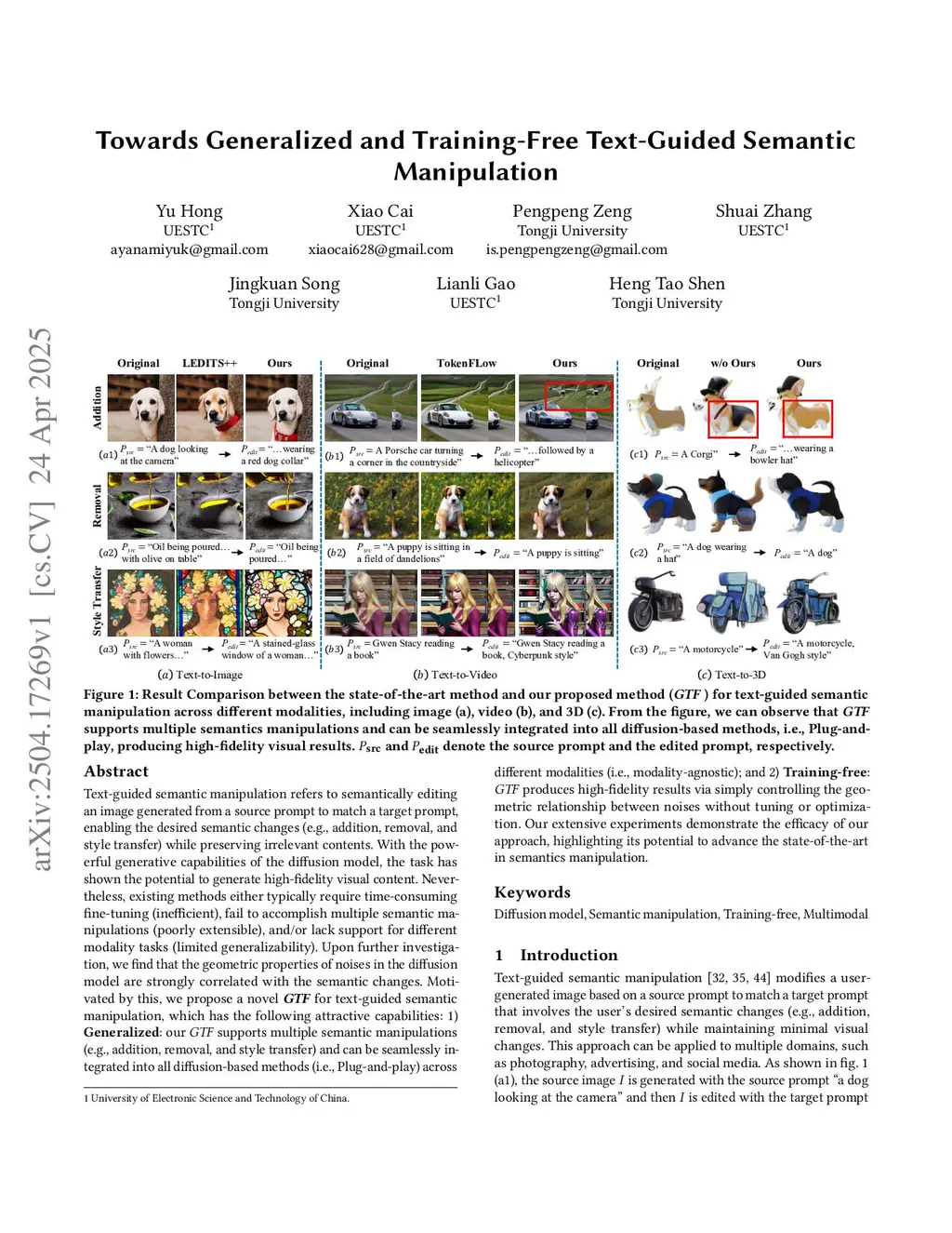 Text-guided semantic manipulation refers to semantically editing an image generated from a source prompt to match a target prompt, enabling the desired semantic changes (e.g., addition, removal, and style transfer) while preserving irrelevant contents. With the powerful generative capabilities of the diffusion model, the task has shown the potential to generate high-fidelity visual content. Nevertheless, existing methods either typically require time-consuming fine-tuning (inefficient), fail to accomplish multiple semantic manipulations (poorly extensible), and/or lack support for different modality tasks (limited generalizability). Upon further investigation, we find that the geometric properties of noises in the diffusion model are strongly correlated with the semantic changes. Motivated by this, we propose a novel for text-guided semantic manipulation, which has the following attractive capabilities: 1) : our supports multiple semantic manipulations (e.g., addition, removal, and style transfer) and can be seamlessly integrated into all diffusion-based methods (i.e., Plug-and-play) across different modalities (i.e., modality-agnostic); and 2) : produces high-fidelity results via simply controlling the geometric relationship between noises without tuning or optimization. Our extensive experiments demonstrate the efficacy of our approach, highlighting its potential to advance the state-of-the-art in semantics manipulation.