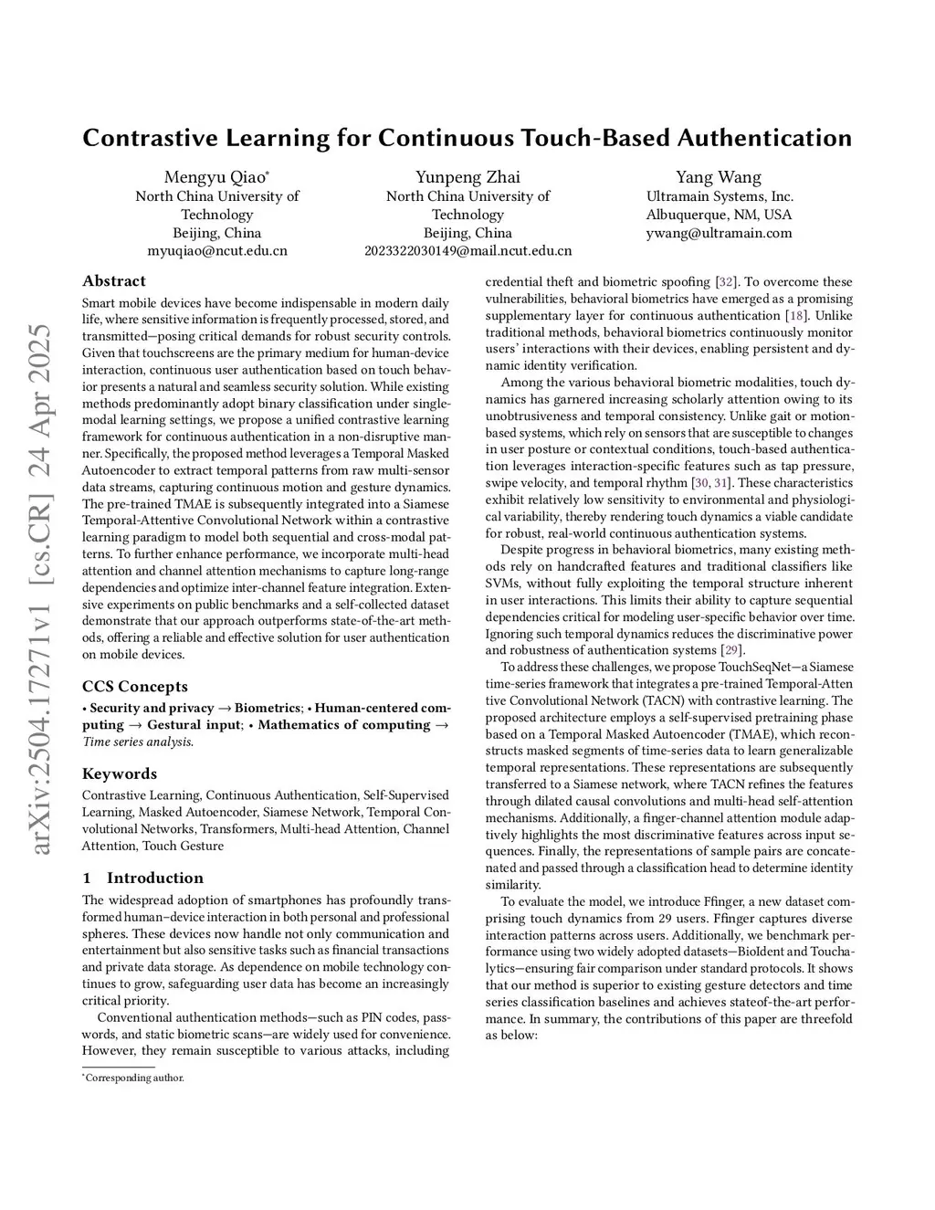 Smart mobile devices have become indispensable in modern daily life, where sensitive information is frequently processed, stored, and transmitted-posing critical demands for robust security controls. Given that touchscreens are the primary medium for human-device interaction, continuous user authentication based on touch behavior presents a natural and seamless security solution. While existing methods predominantly adopt binary classification under single-modal learning settings, we propose a unified contrastive learning framework for continuous authentication in a non-disruptive manner. Specifically, the proposed method leverages a Temporal Masked Autoencoder to extract temporal patterns from raw multi-sensor data streams, capturing continuous motion and gesture dynamics. The pre-trained TMAE is subsequently integrated into a Siamese Temporal-Attentive Convolutional Network within a contrastive learning paradigm to model both sequential and cross-modal patterns. To further enhance performance, we incorporate multi-head attention and channel attention mechanisms to capture long-range dependencies and optimize inter-channel feature integration. Extensive experiments on public benchmarks and a self-collected dataset demonstrate that our approach outperforms state-of-the-art methods, offering a reliable and effective solution for user authentication on mobile devices.