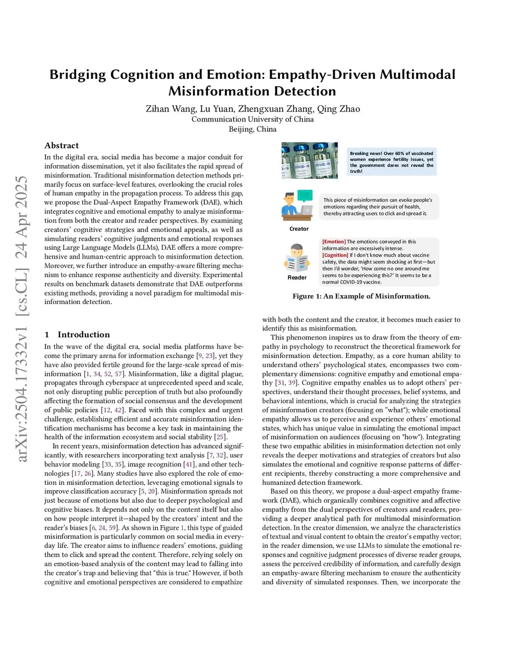 In the digital era, social media has become a major conduit for information dissemination, yet it also facilitates the rapid spread of misinformation. Traditional misinformation detection methods primarily focus on surface-level features, overlooking the crucial roles of human empathy in the propagation process. To address this gap, we propose the Dual-Aspect Empathy Framework (DAE), which integrates cognitive and emotional empathy to analyze misinformation from both the creator and reader perspectives. By examining creators' cognitive strategies and emotional appeals, as well as simulating readers' cognitive judgments and emotional responses using Large Language Models (LLMs), DAE offers a more comprehensive and human-centric approach to misinformation detection. Moreover, we further introduce an empathy-aware filtering mechanism to enhance response authenticity and diversity. Experimental results on benchmark datasets demonstrate that DAE outperforms existing methods, providing a novel paradigm for multimodal misinformation detection.