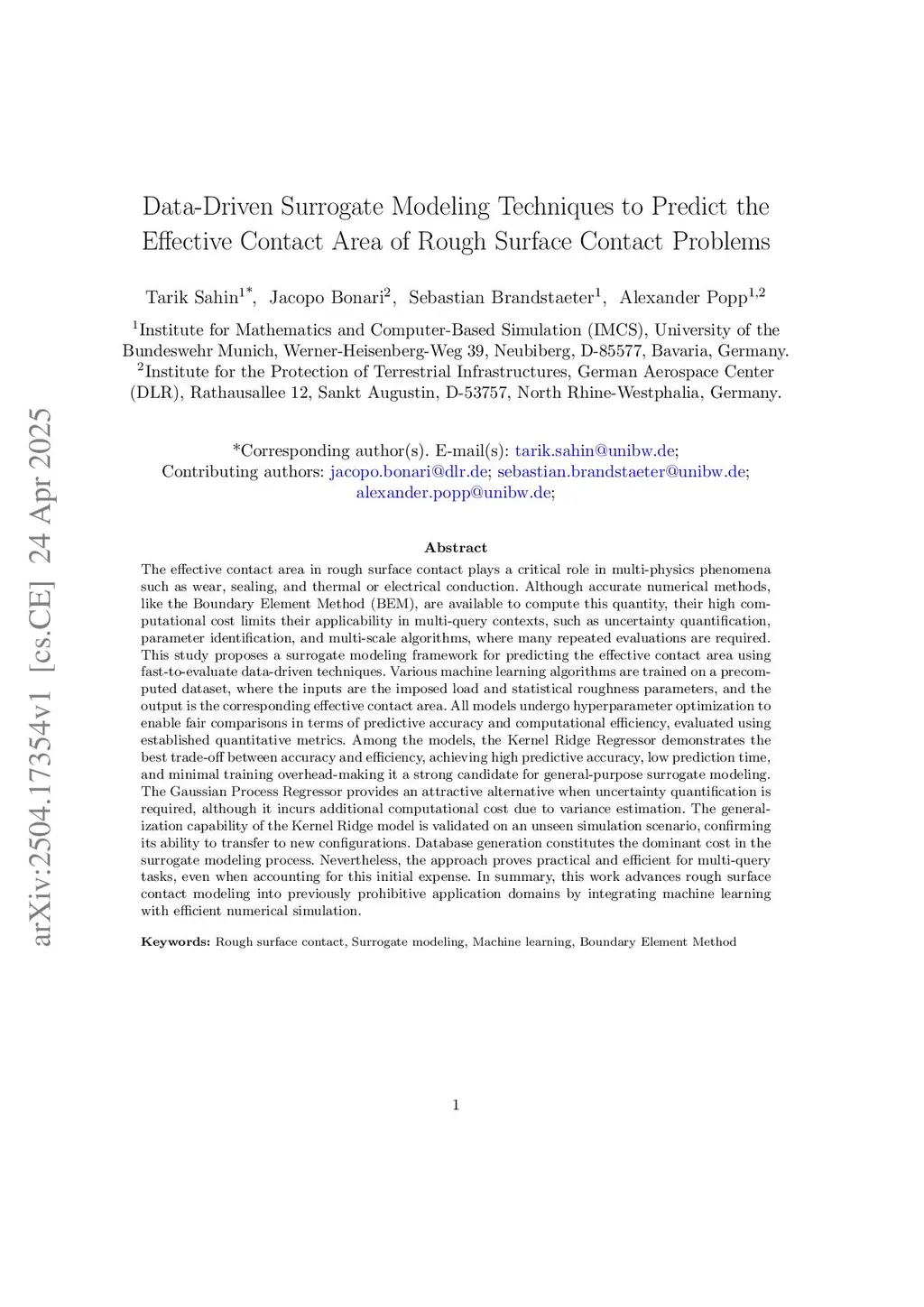 The effective contact area in rough surface contact plays a critical role in multi-physics phenomena such as wear, sealing, and thermal or electrical conduction. Although accurate numerical methods, like the Boundary Element Method (BEM), are available to compute this quantity, their high computational cost limits their applicability in multi-query contexts, such as uncertainty quantification, parameter identification, and multi-scale algorithms, where many repeated evaluations are required. This study proposes a surrogate modeling framework for predicting the effective contact area using fast-to-evaluate data-driven techniques. Various machine learning algorithms are trained on a precomputed dataset, where the inputs are the imposed load and statistical roughness parameters, and the output is the corresponding effective contact area. All models undergo hyperparameter optimization to enable fair comparisons in terms of predictive accuracy and computational efficiency, evaluated using established quantitative metrics. Among the models, the Kernel Ridge Regressor demonstrates the best trade-off between accuracy and efficiency, achieving high predictive accuracy, low prediction time, and minimal training overhead-making it a strong candidate for general-purpose surrogate modeling. The Gaussian Process Regressor provides an attractive alternative when uncertainty quantification is required, although it incurs additional computational cost due to variance estimation. The generalization capability of the Kernel Ridge model is validated on an unseen simulation scenario, confirming its ability to transfer to new configurations. Database generation constitutes the dominant cost in the surrogate modeling process. Nevertheless, the approach proves practical and efficient for multi-query tasks, even when accounting for this initial expense.