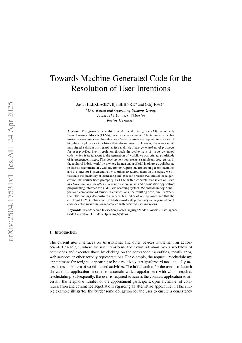 The growing capabilities of Artificial Intelligence (AI), particularly Large Language Models (LLMs), prompt a reassessment of the interaction mechanisms between users and their devices. Currently, users are required to use a set of high-level applications to achieve their desired results. However, the advent of AI may signal a shift in this regard, as its capabilities have generated novel prospects for user-provided intent resolution through the deployment of model-generated code. This development represents a significant progression in the realm of hybrid workflows, where human and artificial intelligence collaborate to address user intentions, with the former responsible for defining these intentions and the latter for implementing the solutions to address them. In this paper, we investigate the feasibility of generating and executing workflows through code generation that results from prompting an LLM with a concrete user intention, and a simplified application programming interface for a GUI-less operating system. We provide an in-depth analysis and comparison of various user intentions, the resulting code, and its execution. The findings demonstrate the general feasibility of our approach and that the employed LLM, GPT-4o-mini, exhibits remarkable proficiency in the generation of code-oriented workflows in accordance with provided user intentions.