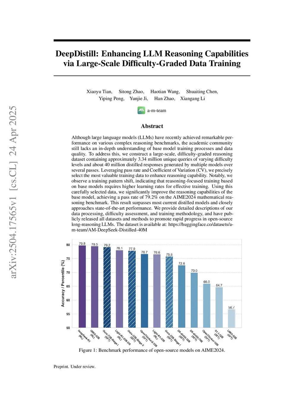 Although large language models (LLMs) have recently achieved remarkable performance on various complex reasoning benchmarks, the academic community still lacks an in-depth understanding of base model training processes and data quality. To address this, we construct a large-scale, difficulty-graded reasoning dataset containing approximately 3.34 million unique queries of varying difficulty levels and about 40 million distilled responses generated by multiple models over several passes. Leveraging pass rate and Coefficient of Variation (CV), we precisely select the most valuable training data to enhance reasoning capability. Notably, we observe a training pattern shift, indicating that reasoning-focused training based on base models requires higher learning rates for effective training. Using this carefully selected data, we significantly improve the reasoning capabilities of the base model, achieving a pass rate of 79.2\% on the AIME2024 mathematical reasoning benchmark. This result surpasses most current distilled models and closely approaches state-of-the-art performance. We provide detailed descriptions of our data processing, difficulty assessment, and training methodology, and have publicly released all datasets and methods to promote rapid progress in open-source long-reasoning LLMs. The dataset is available at: \href{this https URL}{this https URL}