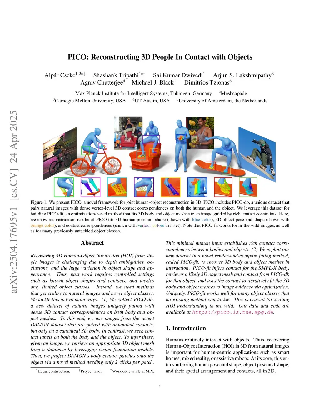 Recovering 3D Human-Object Interaction (HOI) from single color images is challenging due to depth ambiguities, occlusions, and the huge variation in object shape and appearance. Thus, past work requires controlled settings such as known object shapes and contacts, and tackles only limited object classes. Instead, we need methods that generalize to natural images and novel object classes. We tackle this in two main ways: (1) We collect PICO-db, a new dataset of natural images uniquely paired with dense 3D contact on both body and object meshes. To this end, we use images from the recent DAMON dataset that are paired with contacts, but these contacts are only annotated on a canonical 3D body. In contrast, we seek contact labels on both the body and the object. To infer these given an image, we retrieve an appropriate 3D object mesh from a database by leveraging vision foundation models. Then, we project DAMON's body contact patches onto the object via a novel method needing only 2 clicks per patch. This minimal human input establishes rich contact correspondences between bodies and objects. (2) We exploit our new dataset of contact correspondences in a novel render-and-compare fitting method, called PICO-fit, to recover 3D body and object meshes in interaction. PICO-fit infers contact for the SMPL-X body, retrieves a likely 3D object mesh and contact from PICO-db for that object, and uses the contact to iteratively fit the 3D body and object meshes to image evidence via optimization. Uniquely, PICO-fit works well for many object categories that no existing method can tackle. This is crucial to enable HOI understanding to scale in the wild. Our data and code are available atthis https URL.