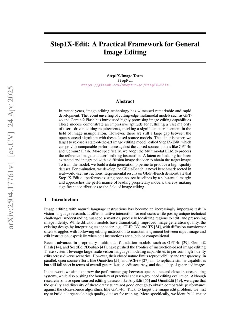 In recent years, image editing models have witnessed remarkable and rapid development. The recent unveiling of cutting-edge multimodal models such as GPT-4o and Gemini2 Flash has introduced highly promising image editing capabilities. These models demonstrate an impressive aptitude for fulfilling a vast majority of user-driven editing requirements, marking a significant advancement in the field of image manipulation. However, there is still a large gap between the open-source algorithm with these closed-source models. Thus, in this paper, we aim to release a state-of-the-art image editing model, called Step1X-Edit, which can provide comparable performance against the closed-source models like GPT-4o and Gemini2 Flash. More specifically, we adopt the Multimodal LLM to process the reference image and the user's editing instruction. A latent embedding has been extracted and integrated with a diffusion image decoder to obtain the target image. To train the model, we build a data generation pipeline to produce a high-quality dataset. For evaluation, we develop the GEdit-Bench, a novel benchmark rooted in real-world user instructions. Experimental results on GEdit-Bench demonstrate that Step1X-Edit outperforms existing open-source baselines by a substantial margin and approaches the performance of leading proprietary models, thereby making significant contributions to the field of image editing.