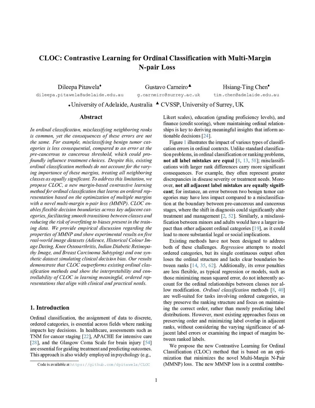 CLOC: Contrastive Learning for Ordinal Classification with Multi-Margin N-pair Loss