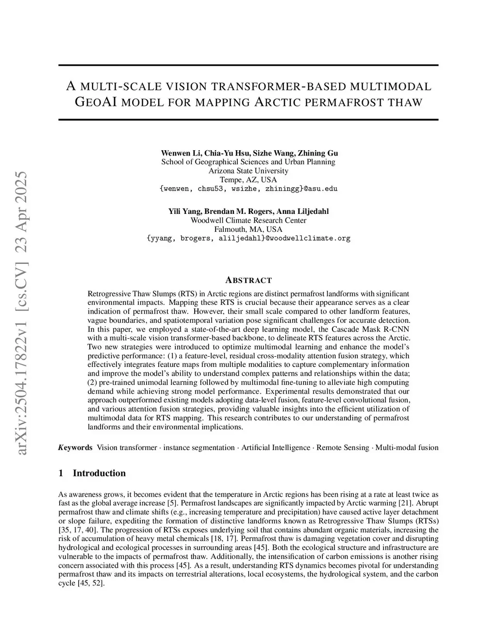 Retrogressive Thaw Slumps (RTS) in Arctic regions are distinct permafrost landforms with significant environmental impacts. Mapping these RTS is crucial because their appearance serves as a clear indication of permafrost thaw. However, their small scale compared to other landform features, vague boundaries, and spatiotemporal variation pose significant challenges for accurate detection. In this paper, we employed a state-of-the-art deep learning model, the Cascade Mask R-CNN with a multi-scale vision transformer-based backbone, to delineate RTS features across the Arctic. Two new strategies were introduced to optimize multimodal learning and enhance the model's predictive performance: (1) a feature-level, residual cross-modality attention fusion strategy, which effectively integrates feature maps from multiple modalities to capture complementary information and improve the model's ability to understand complex patterns and relationships within the data; (2) pre-trained unimodal learning followed by multimodal fine-tuning to alleviate high computing demand while achieving strong model performance. Experimental results demonstrated that our approach outperformed existing models adopting data-level fusion, feature-level convolutional fusion, and various attention fusion strategies, providing valuable insights into the efficient utilization of multimodal data for RTS mapping. This research contributes to our understanding of permafrost landforms and their environmental implications.