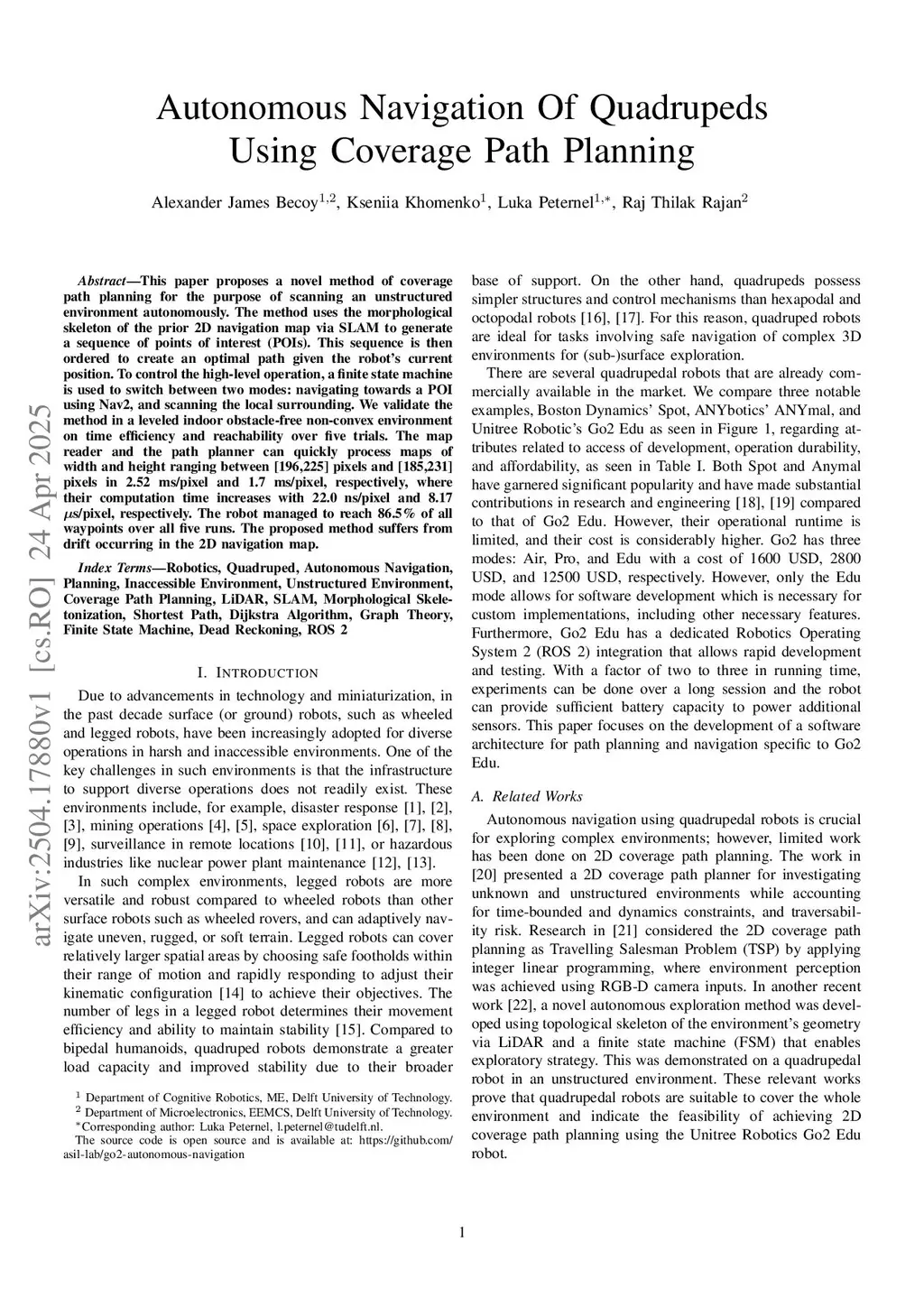 Autonomous Navigation of Quadrupeds Using Coverage Path Planning with Morphological Skeleton Map