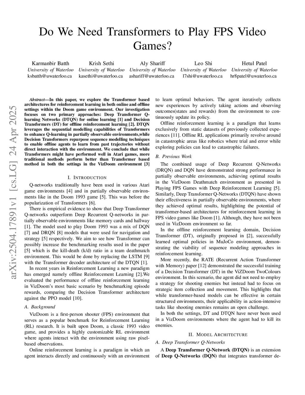In this paper, we explore the Transformer based architectures for reinforcement learning in both online and offline settings within the Doom game environment. Our investigation focuses on two primary approaches: Deep Transformer Q- learning Networks (DTQN) for online learning and Decision Transformers (DT) for offline reinforcement learning. DTQN leverages the sequential modelling capabilities of Transformers to enhance Q-learning in partially observable environments,while Decision Transformers repurpose sequence modelling techniques to enable offline agents to learn from past trajectories without direct interaction with the environment. We conclude that while Transformers might have performed well in Atari games, more traditional methods perform better than Transformer based method in both the settings in the VizDoom environment.