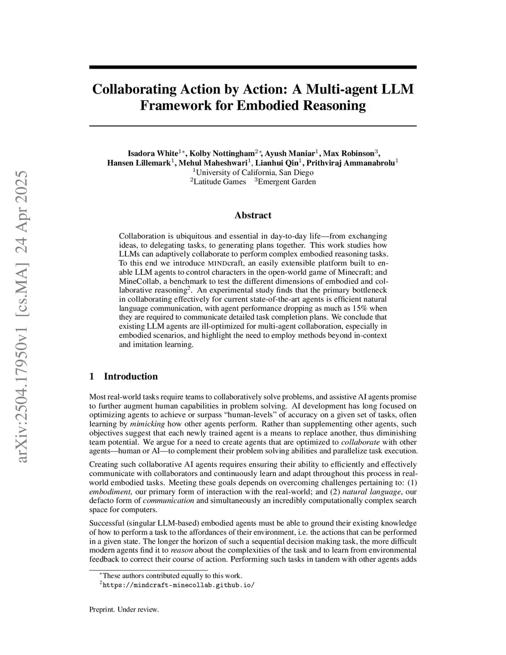 Collaboration is ubiquitous and essential in day-to-day life -- from exchanging ideas, to delegating tasks, to generating plans together. This work studies how LLMs can adaptively collaborate to perform complex embodied reasoning tasks. To this end we introduce MINDcraft, an easily extensible platform built to enable LLM agents to control characters in the open-world game of Minecraft; and MineCollab, a benchmark to test the different dimensions of embodied and collaborative reasoning. An experimental study finds that the primary bottleneck in collaborating effectively for current state-of-the-art agents is efficient natural language communication, with agent performance dropping as much as 15% when they are required to communicate detailed task completion plans. We conclude that existing LLM agents are ill-optimized for multi-agent collaboration, especially in embodied scenarios, and highlight the need to employ methods beyond in-context and imitation learning. Our website can be found here:this https URL