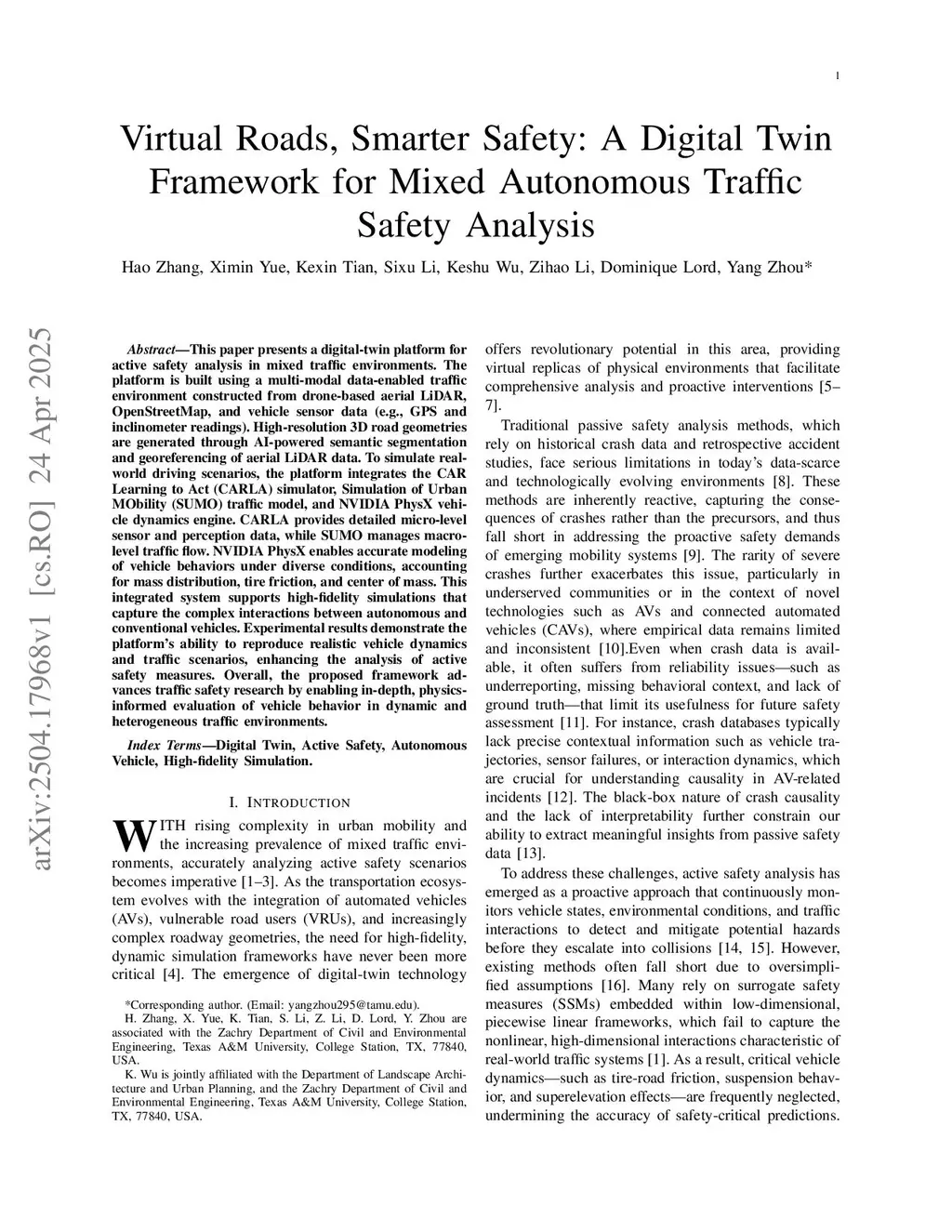 This paper presents a digital-twin platform for active safety analysis in mixed traffic environments. The platform is built using a multi-modal data-enabled traffic environment constructed from drone-based aerial LiDAR, OpenStreetMap, and vehicle sensor data (e.g., GPS and inclinometer readings). High-resolution 3D road geometries are generated through AI-powered semantic segmentation and georeferencing of aerial LiDAR data. To simulate real-world driving scenarios, the platform integrates the CAR Learning to Act (CARLA) simulator, Simulation of Urban MObility (SUMO) traffic model, and NVIDIA PhysX vehicle dynamics engine. CARLA provides detailed micro-level sensor and perception data, while SUMO manages macro-level traffic flow. NVIDIA PhysX enables accurate modeling of vehicle behaviors under diverse conditions, accounting for mass distribution, tire friction, and center of mass. This integrated system supports high-fidelity simulations that capture the complex interactions between autonomous and conventional vehicles. Experimental results demonstrate the platform's ability to reproduce realistic vehicle dynamics and traffic scenarios, enhancing the analysis of active safety measures. Overall, the proposed framework advances traffic safety research by enabling in-depth, physics-informed evaluation of vehicle behavior in dynamic and heterogeneous traffic environments.
