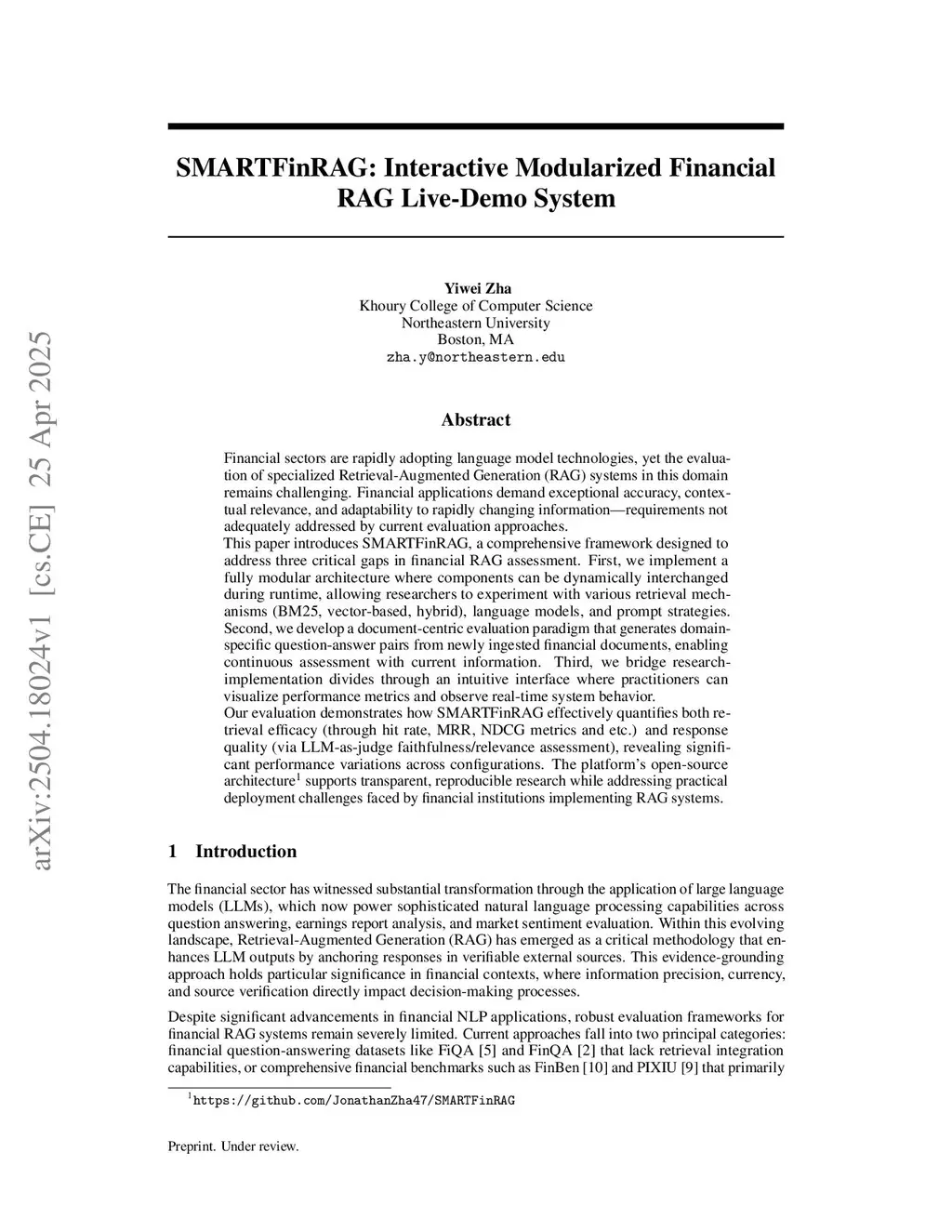 Financial sectors are rapidly adopting language model technologies, yet evaluating specialized RAG systems in this domain remains challenging. This paper introduces SMARTFinRAG, addressing three critical gaps in financial RAG assessment: (1) a fully modular architecture where components can be dynamically interchanged during runtime; (2) a document-centric evaluation paradigm generating domain-specific QA pairs from newly ingested financial documents; and (3) an intuitive interface bridging research-implementation divides. Our evaluation quantifies both retrieval efficacy and response quality, revealing significant performance variations across configurations. The platform's open-source architecture supports transparent, reproducible research while addressing practical deployment challenges faced by financial institutions implementing RAG systems.