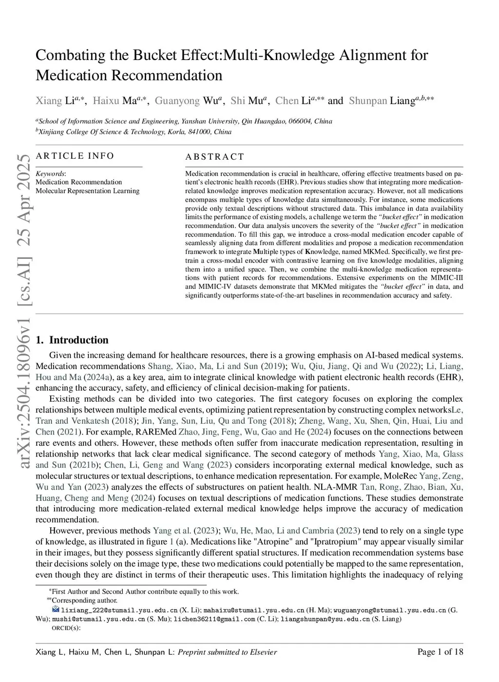 Medication recommendation is crucial in healthcare, offering effective treatments based on patient's electronic health records (EHR). Previous studies show that integrating more medication-related knowledge improves medication representation accuracy. However, not all medications encompass multiple types of knowledge data simultaneously. For instance, some medications provide only textual descriptions without structured data. This imbalance in data availability limits the performance of existing models, a challenge we term the "bucket effect" in medication recommendation. Our data analysis uncovers the severity of the "bucket effect" in medication recommendation. To fill this gap, we introduce a cross-modal medication encoder capable of seamlessly aligning data from different modalities and propose a medication recommendation framework to integrate Multiple types of Knowledge, named MKMed. Specifically, we first pre-train a cross-modal encoder with contrastive learning on five knowledge modalities, aligning them into a unified space. Then, we combine the multi-knowledge medication representations with patient records for recommendations. Extensive experiments on the MIMIC-III and MIMIC-IV datasets demonstrate that MKMed mitigates the "bucket effect" in data, and significantly outperforms state-of-the-art baselines in recommendation accuracy and safety.