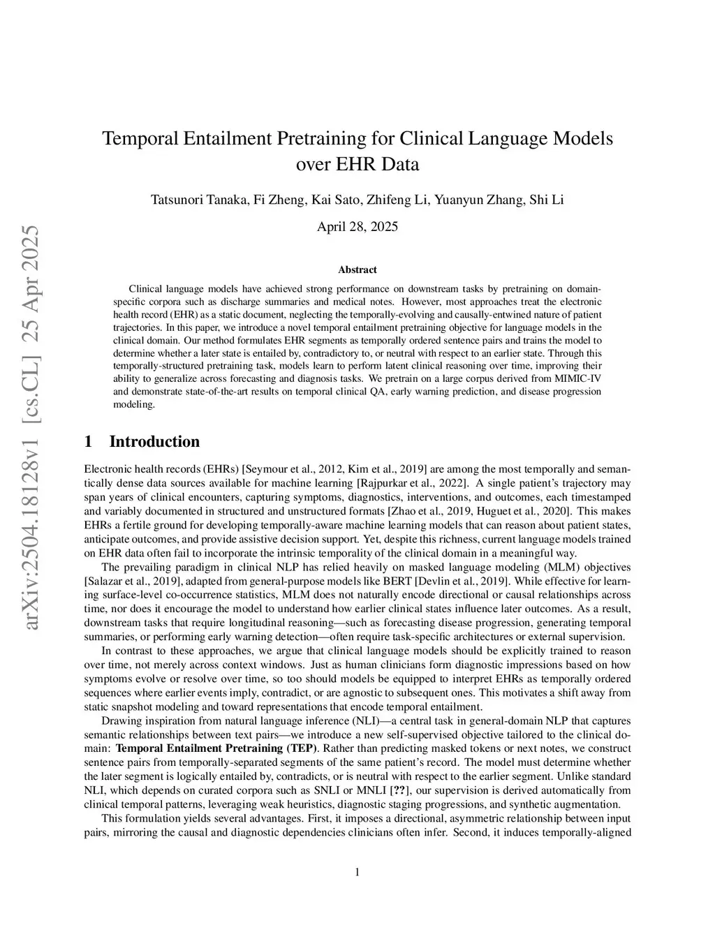 Clinical language models have achieved strong performance on downstream tasks by pretraining on domain specific corpora such as discharge summaries and medical notes. However, most approaches treat the electronic health record as a static document, neglecting the temporally-evolving and causally entwined nature of patient trajectories. In this paper, we introduce a novel temporal entailment pretraining objective for language models in the clinical domain. Our method formulates EHR segments as temporally ordered sentence pairs and trains the model to determine whether a later state is entailed by, contradictory to, or neutral with respect to an earlier state. Through this temporally structured pretraining task, models learn to perform latent clinical reasoning over time, improving their ability to generalize across forecasting and diagnosis tasks. We pretrain on a large corpus derived from MIMIC IV and demonstrate state of the art results on temporal clinical QA, early warning prediction, and disease progression modeling.