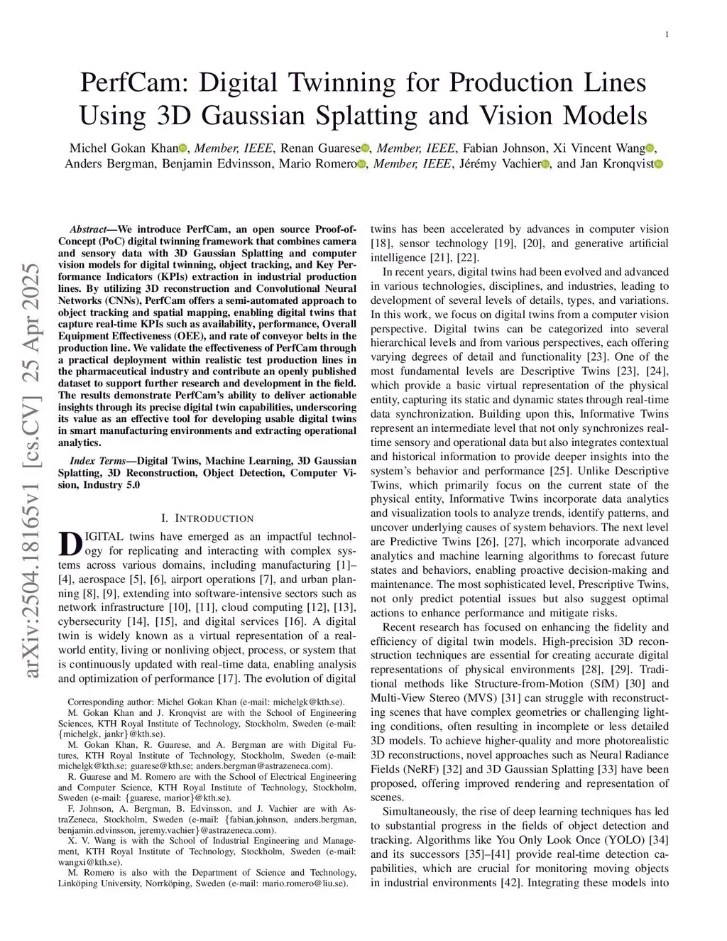 We introduce PerfCam, an open source Proof-of-Concept (PoC) digital twinning framework that combines camera and sensory data with 3D Gaussian Splatting and computer vision models for digital twinning, object tracking, and Key Performance Indicators (KPIs) extraction in industrial production lines. By utilizing 3D reconstruction and Convolutional Neural Networks (CNNs), PerfCam offers a semi-automated approach to object tracking and spatial mapping, enabling digital twins that capture real-time KPIs such as availability, performance, Overall Equipment Effectiveness (OEE), and rate of conveyor belts in the production line. We validate the effectiveness of PerfCam through a practical deployment within realistic test production lines in the pharmaceutical industry and contribute an openly published dataset to support further research and development in the field. The results demonstrate PerfCam's ability to deliver actionable insights through its precise digital twin capabilities, underscoring its value as an effective tool for developing usable digital twins in smart manufacturing environments and extracting operational analytics.