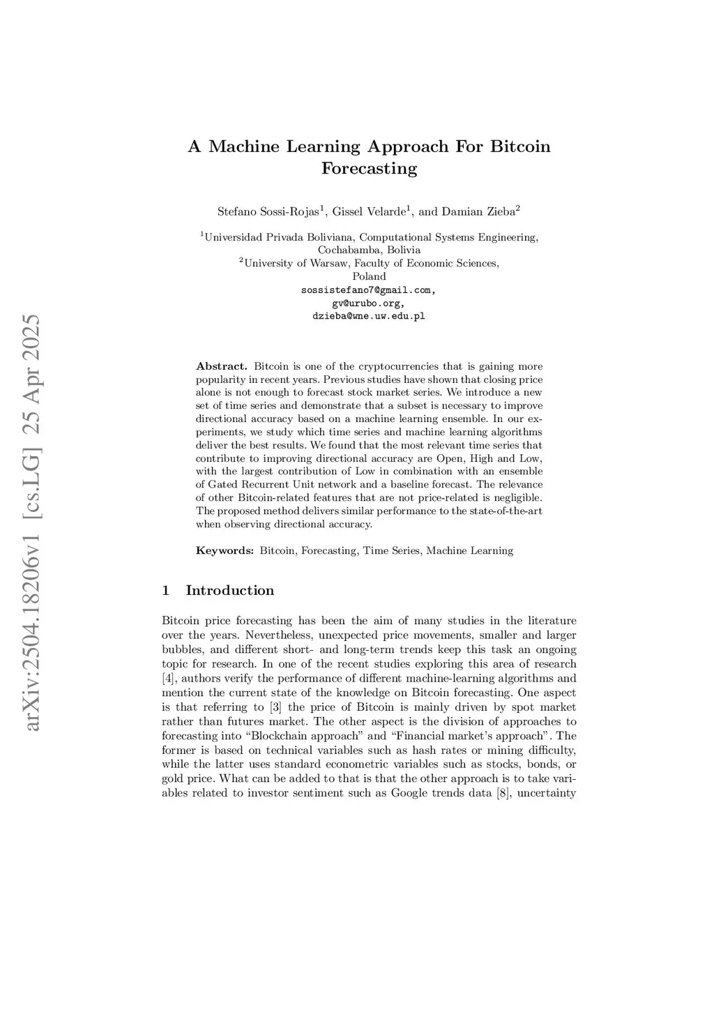 A Machine Learning Approach For Bitcoin Forecasting