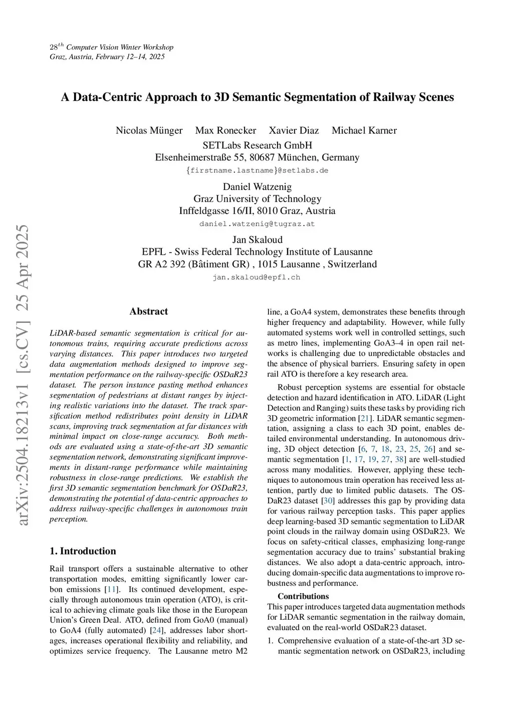 LiDAR-based semantic segmentation is critical for autonomous trains, requiring accurate predictions across varying distances. This paper introduces two targeted data augmentation methods designed to improve segmentation performance on the railway-specific OSDaR23 dataset. The person instance pasting method enhances segmentation of pedestrians at distant ranges by injecting realistic variations into the dataset. The track sparsification method redistributes point density in LiDAR scans, improving track segmentation at far distances with minimal impact on close-range accuracy. Both methods are evaluated using a state-of-the-art 3D semantic segmentation network, demonstrating significant improvements in distant-range performance while maintaining robustness in close-range predictions. We establish the first 3D semantic segmentation benchmark for OSDaR23, demonstrating the potential of data-centric approaches to address railway-specific challenges in autonomous train perception.