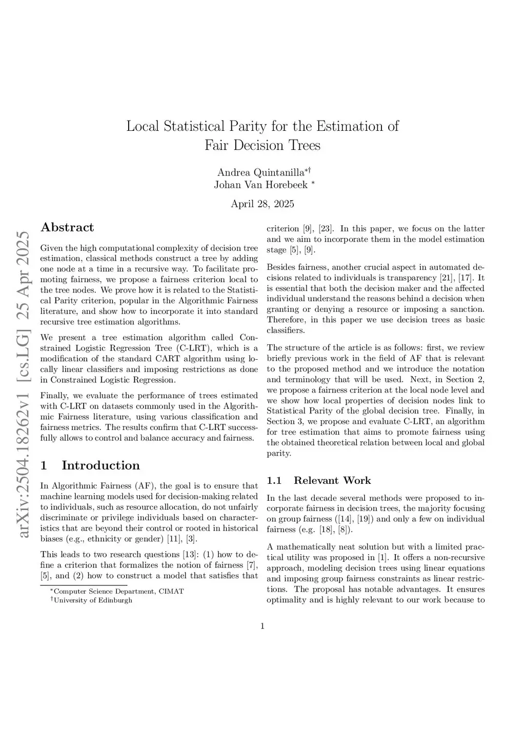 Given the high computational complexity of decision tree estimation, classical methods construct a tree by adding one node at a time in a recursive way. To facilitate promoting fairness, we propose a fairness criterion local to the tree nodes. We prove how it is related to the Statistical Parity criterion, popular in the Algorithmic Fairness literature, and show how to incorporate it into standard recursive tree estimation algorithms.We present a tree estimation algorithm called Constrained Logistic Regression Tree (C-LRT), which is a modification of the standard CART algorithm using locally linear classifiers and imposing restrictions as done in Constrained Logistic Regression.Finally, we evaluate the performance of trees estimated with C-LRT on datasets commonly used in the Algorithmic Fairness literature, using various classification and fairness metrics. The results confirm that C-LRT successfully allows to control and balance accuracy and fairness.