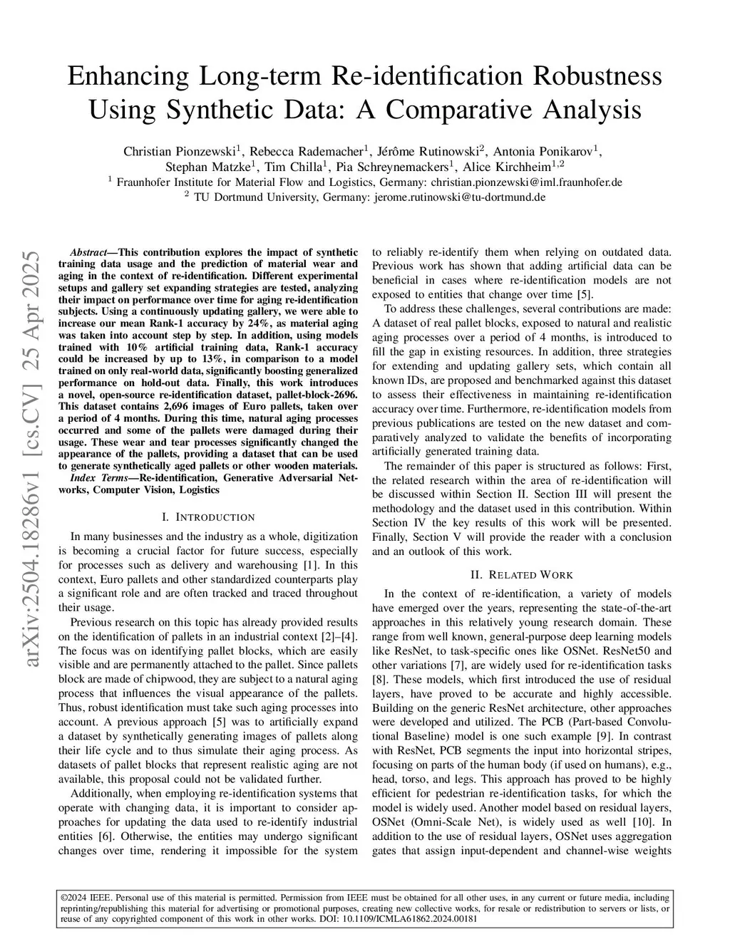 This contribution explores the impact of synthetic training data usage and the prediction of material wear and aging in the context of re-identification. Different experimental setups and gallery set expanding strategies are tested, analyzing their impact on performance over time for aging re-identification subjects. Using a continuously updating gallery, we were able to increase our mean Rank-1 accuracy by 24%, as material aging was taken into account step by step. In addition, using models trained with 10% artificial training data, Rank-1 accuracy could be increased by up to 13%, in comparison to a model trained on only real-world data, significantly boosting generalized performance on hold-out data. Finally, this work introduces a novel, open-source re-identification dataset, pallet-block-2696. This dataset contains 2,696 images of Euro pallets, taken over a period of 4 months. During this time, natural aging processes occurred and some of the pallets were damaged during their usage. These wear and tear processes significantly changed the appearance of the pallets, providing a dataset that can be used to generate synthetically aged pallets or other wooden materials.