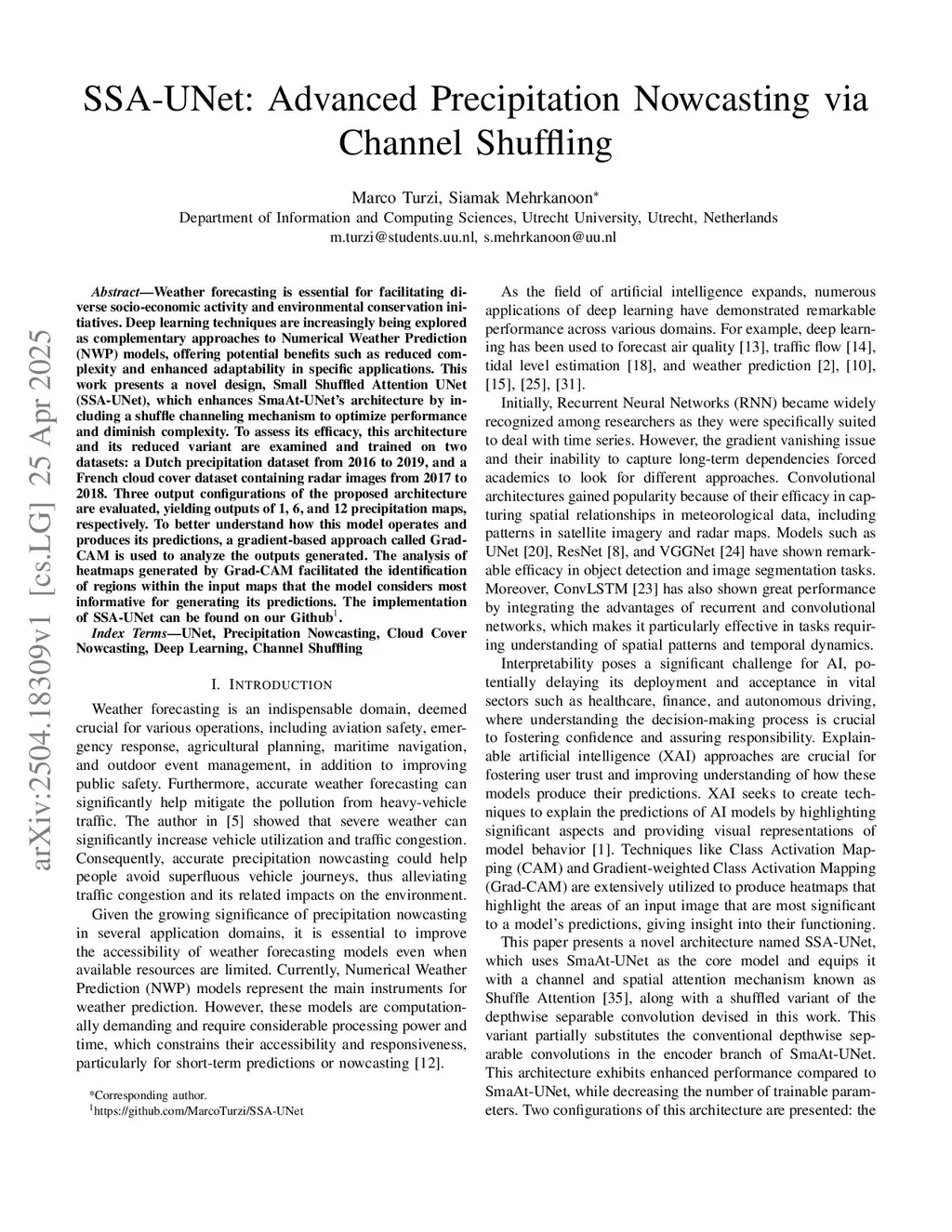 Weather forecasting is essential for facilitating diverse socio-economic activity and environmental conservation initiatives. Deep learning techniques are increasingly being explored as complementary approaches to Numerical Weather Prediction (NWP) models, offering potential benefits such as reduced complexity and enhanced adaptability in specific applications. This work presents a novel design, Small Shuffled Attention UNet (SSA-UNet), which enhances SmaAt-UNet's architecture by including a shuffle channeling mechanism to optimize performance and diminish complexity. To assess its efficacy, this architecture and its reduced variant are examined and trained on two datasets: a Dutch precipitation dataset from 2016 to 2019, and a French cloud cover dataset containing radar images from 2017 to 2018. Three output configurations of the proposed architecture are evaluated, yielding outputs of 1, 6, and 12 precipitation maps, respectively. To better understand how this model operates and produces its predictions, a gradient-based approach called Grad-CAM is used to analyze the outputs generated. The analysis of heatmaps generated by Grad-CAM facilitated the identification of regions within the input maps that the model considers most informative for generating its predictions. The implementation of SSA-UNet can be found on our Github\footnote{\href{this https URL}{this https URL}}