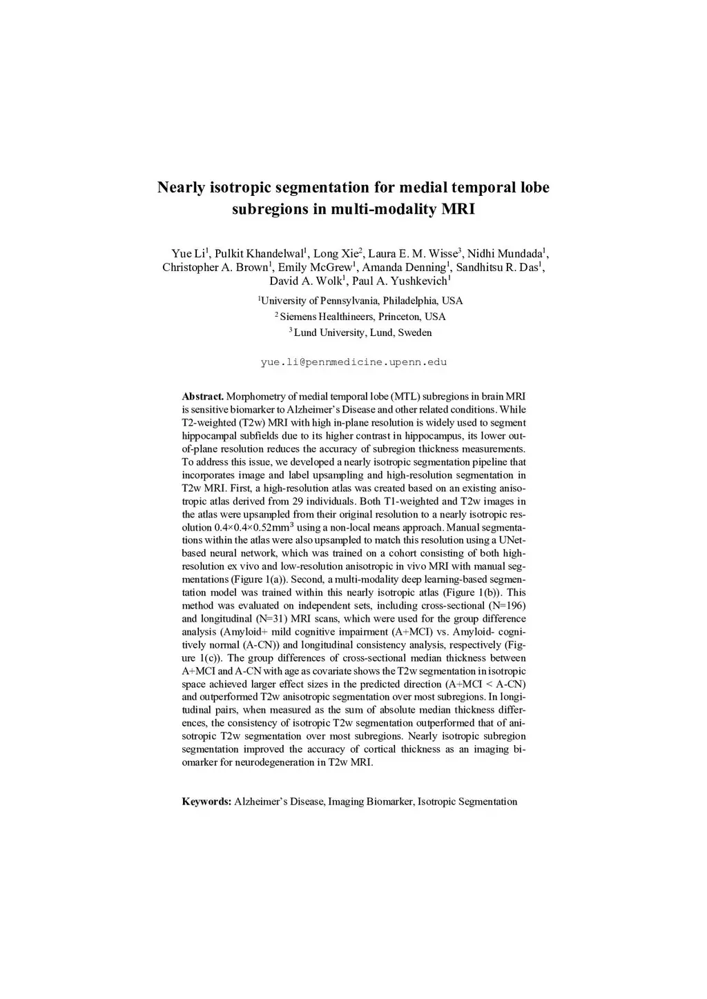 The medial temporal lobe (MTL) is a region impacted extensively and non-uniformly in early stages of Alzheimer's disease (AD). Regional MTL morphometric measures extracted from magnetic resonance imaging (MRI) are supportive features for the diagnosis of AD and related disorders (ADRD). Different MRI modalities have distinct advantages for MTL morphometry. Anisotropic T2-weighted (T2w) MRI is preferred for hippocampal subfields due to its higher contrast between hippocampal layers. Isotropic T1-weighted (T1w) MRI is beneficial for thickness calculation of extra-hippocampal subregions due to its stable image quality and isotropic resolution. We propose a multi-modality MTL segmentation algorithm that bridges the T1w and T2w modalities by bringing both to a nearly isotropic voxel space. Guided by high-resolution ex vivo 9.4T MRI, an upsampling model was designed for the ground truth segmentations. Combined with non-local means upsampling, this model was used to construct a nearly iso-tropic T1w and T2w MTL subregion segmentation training set, which was used to train a nnUNet model. Morphometric biomarkers extracted by this model were compared to those extracted using conventional models operating in anisotropic spaces on downstream tasks. Biomarkers extracted using the proposed model had greater ability to discriminate between individuals with mild cognitive impairment and cognitively unimpaired; and had great-er longitudinal stability. These findings suggest that the biomarkers derived from T1w and T2w MRI unsampled to nearly isotropic resolution have sig-nificant potential for improving disease diagnosis and monitoring disease progression in ADRD.